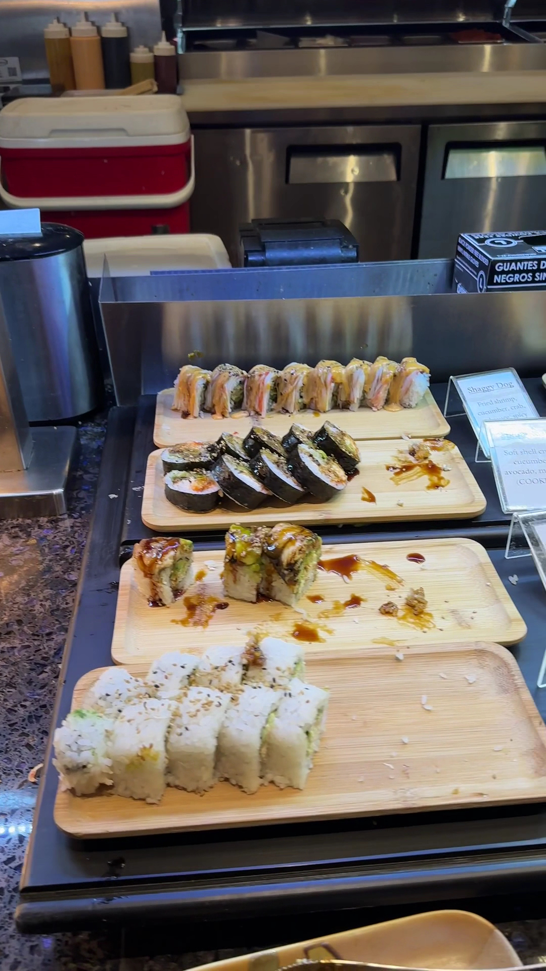 We came 45 mins before closing but they were already cleaning up the area. My boyfriend was waiting for the chef to restock the inari sushi, but they never did and he was pretty sad. They also offer hot pot, but it's just a plain broth and there's a counter for veggies & seafood. They didn't have any sliced meats, so that was disappointing. There's a small menu on the table if you want to order something from the server. I didn't see it until the end but it has grilled oysters and eel nigiri, along with ramen and soups. Most of the entrees look like it's been sitting out for some time and don't look that appetizing. I guess that the best time to go would probably be during rush dinner hours if you want fresh food.