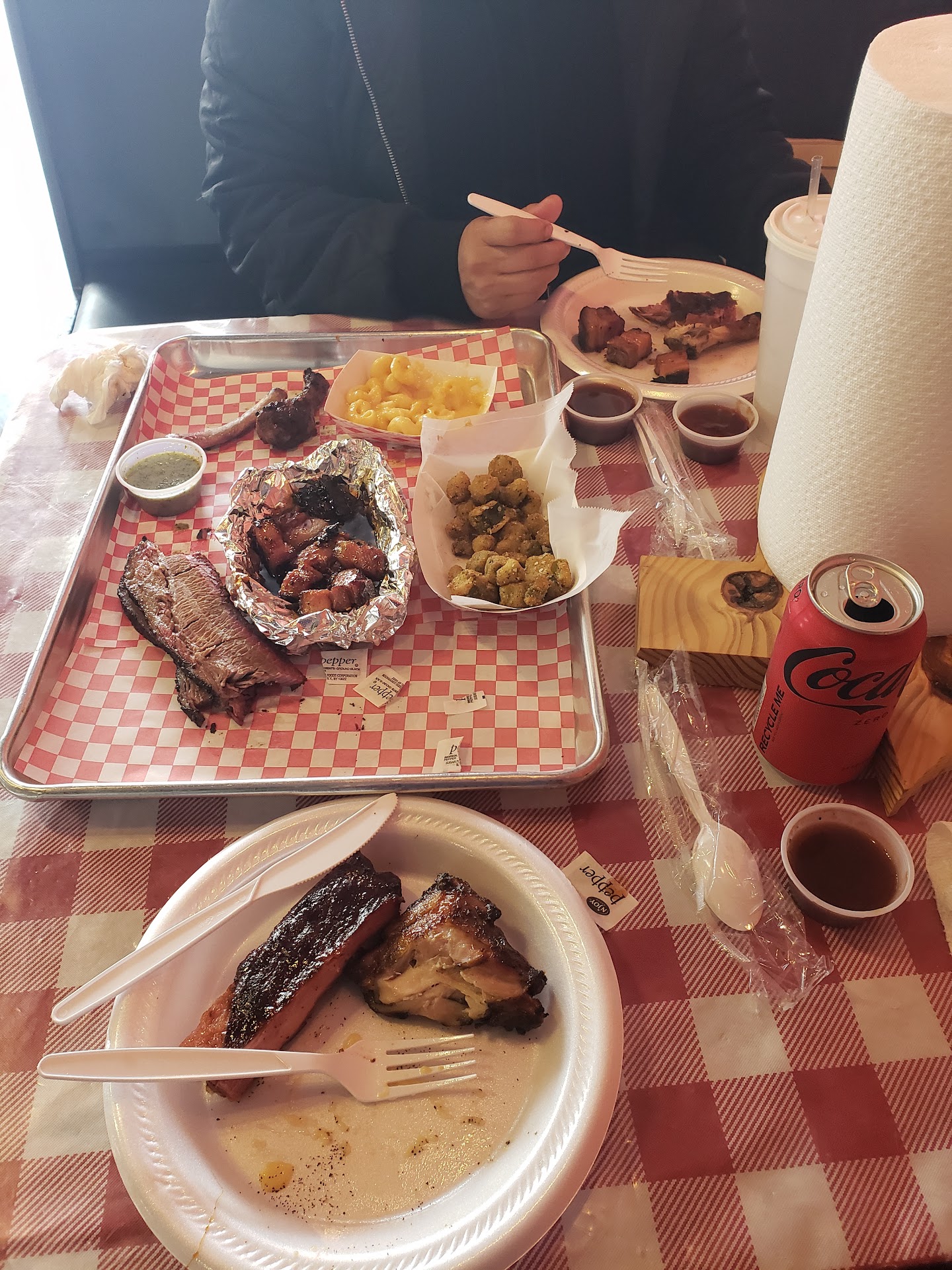 We had the three meat plate (we chose the lean brisket, pork ribs, and the aforementioned jerk chicken), mac & cheese, fried okra, and an order of Hog Bites (pork belly). Everything was wonderful and the staff was very nice. Even the lean brisket (which we have tried at other places and was disappointingly dry) was fork tender and moist.