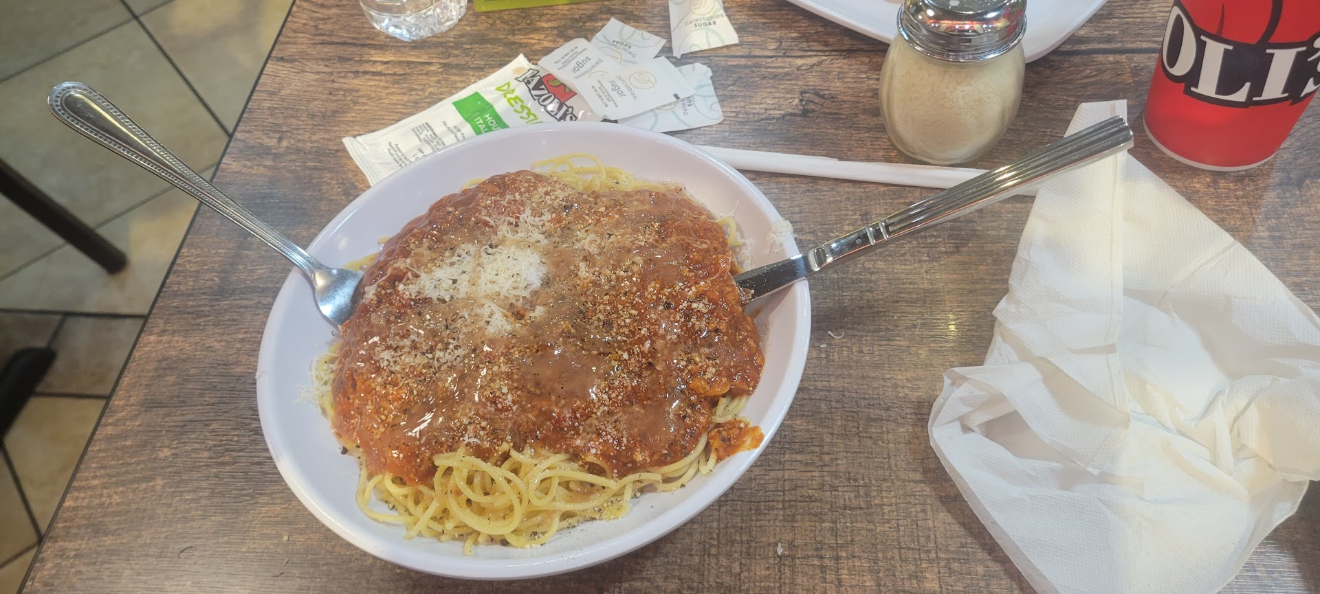 Read moreHave had better food. Ravioli garlic chicken is the best, but had a coupon on the Fazolis app for a sampler plate (Spaghetti w/ a meatball, lasagna, and Fettuccine Alfredo), so decided to give it a try. My husband had spaghetti with meatballs. I've never tasted the meatballs before, and it definitely wasn't my forte. I didn't like the flavor, or mushy texture. I asked my husband if this was the norm for the meatballs, he said yes. The outer edging of the lasagna was pushing the drier/crunchier side of things, and truth be told, I decided that I didn't really care for the sauce on it, or the spaghetti. I generally don't eat the dishes that use the "red sauce," and now I know why. The employees (RJ and Michelle) were great! Helpful, attentive, and did inquire about how our meal was. I did relay this information, they apologized, and said I should've said something, and they'd have made it right. Said it wasn't their fault that the meatballs were mushy, and that I didn't like the flavor of the "red sauce," as they're working with what they've been given. I just won't order any meatballs or red sauced dishes again. Hopefully Fazolis keeps the garlic chicken ravioli, think it was listed as a "limited time" menu item, as that's...