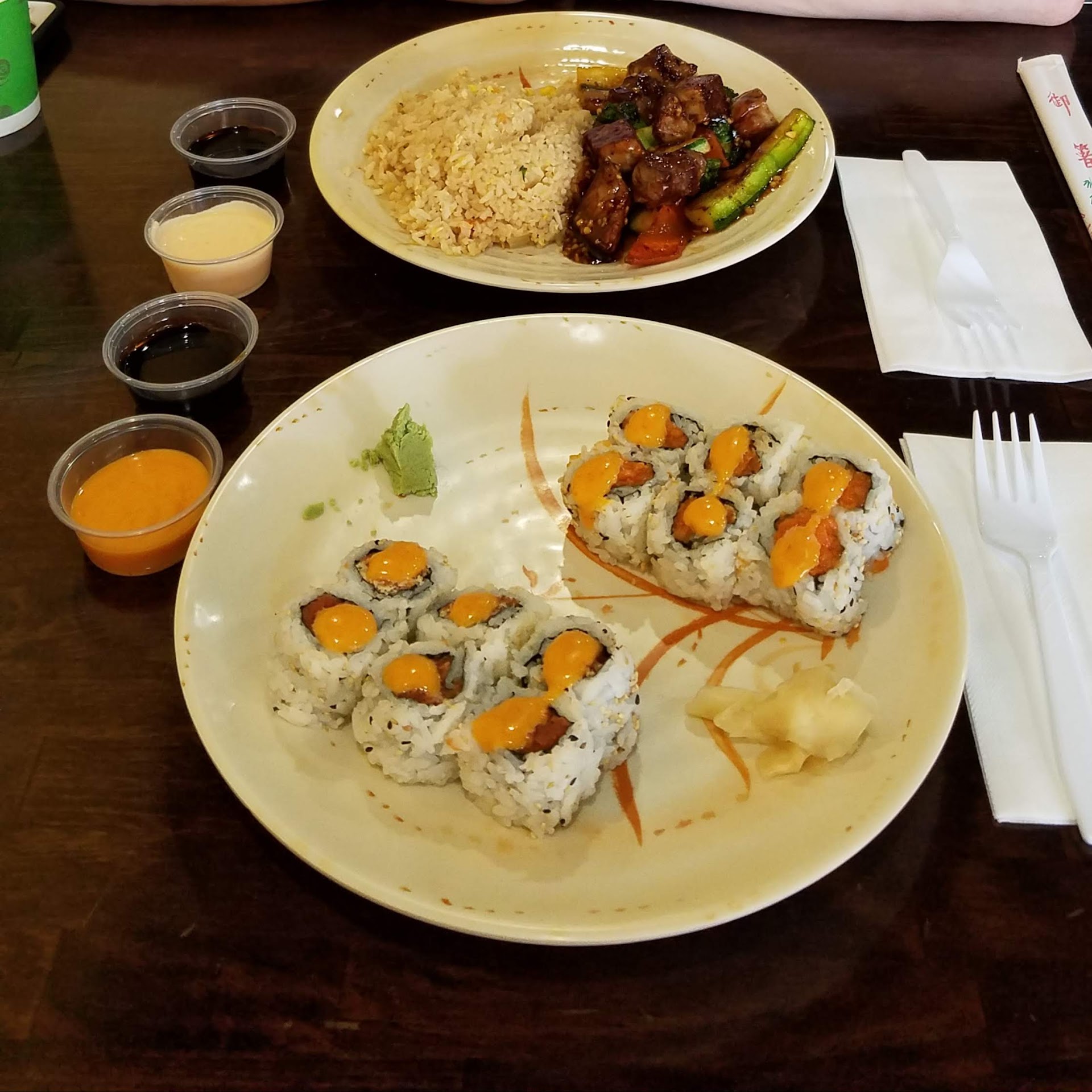 Read moreThe good: The sushi is alright for the price. The 8 roll party platter thing is a GREAT deal for 2 people to split and get more sushi than you can eat for 15 bucks a piece. It's also one of the few oriental food places that has owners smart enough to hire native English speakers to answer the phones and take orders. Although they still seem to not trust them enough to walk more than 10 feet from the cash register. Shame.
