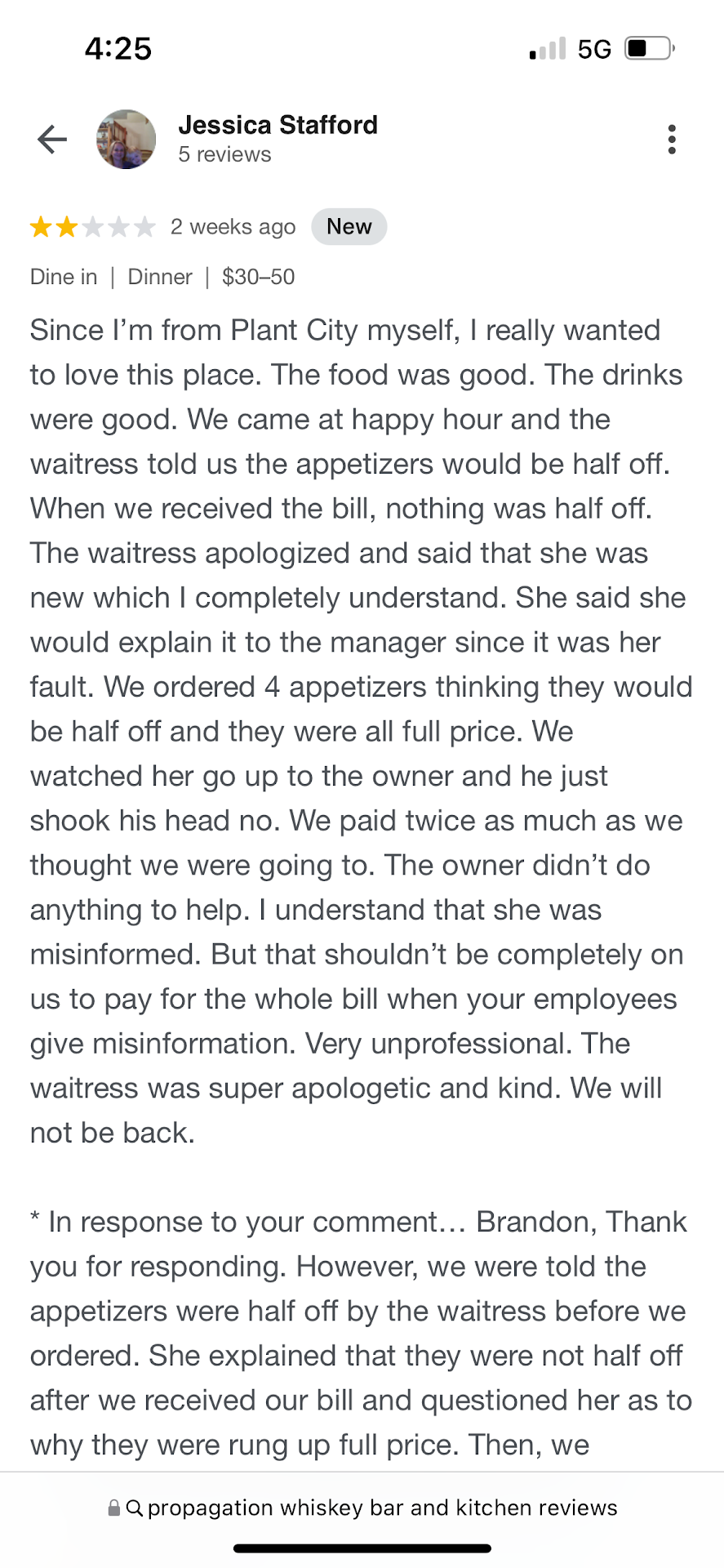 In response to your comment… Brandon, Thank you for responding. However, we were told the appetizers were half off by the waitress before we ordered. She explained that they were not half off after we received our bill and questioned her as to why they were rung up full price. Then, we watched her walk over to you to let you know that we were told by her when we sat down that the appetizers would be half off when in fact, they are full price. We saw you shake your head no and then she came back to our table and said that she was sorry, but there was nothing she could do. Since we did not want the waitress to feel bad, we went ahead and paid for the bill. We definitely DID NOT insist on paying and I am unsure why you said this in your response when you never even came to talk to us about the mix up. There was communication. We communicated with the waitress that she told us It was half off and brought us a bill that was full price. She communicated to you that we were questioning why our bill was full price when she told us that the food was 1/2 off for happy hour. She communicated to us that you said that there was nothing you could do even though she gave us misinformation. She communicated how sorry she was that she was wrong. Then we paid .., not insisting… but because that is the bill we were given and we are not just going...