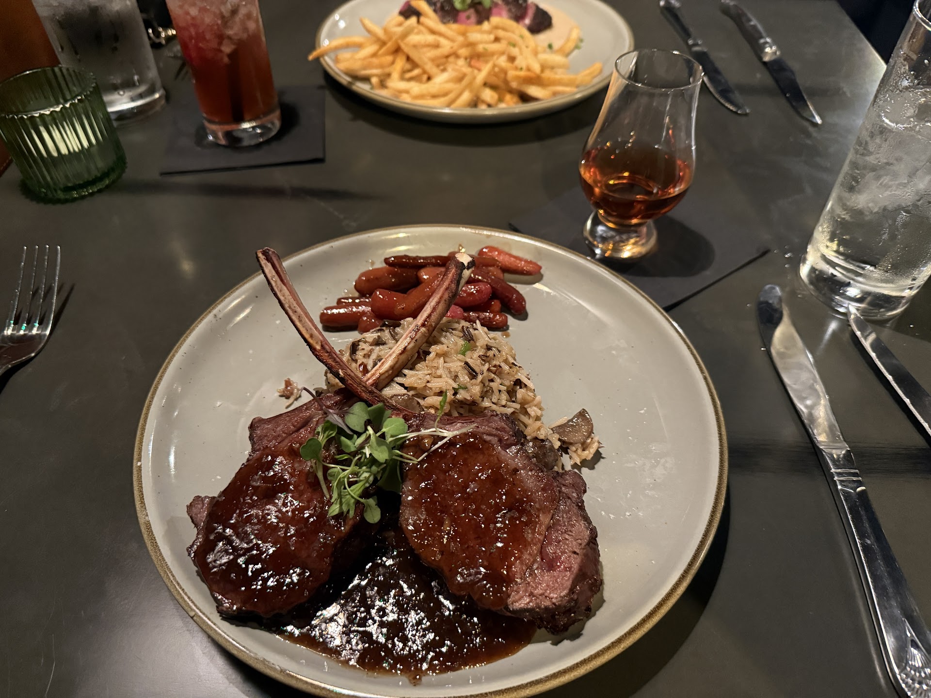 I ordered the venison rack which was served with a bourbon jam over a bed of wild grains and mushrooms and bourbon glazed carrots. I also ordered medium rare, and once again it was cooked to perfection. This was probably one of the best higher end restaurant meals I’ve ever had… perhaps surpassed by a steak dinner I had on a Disney cruise once, but also perhaps not. Most definitely beat out my steak experiences at Berns and Charlie’s in Tampa. The flavor and balance was exceptional. Most definitely a 6/5 stars here!