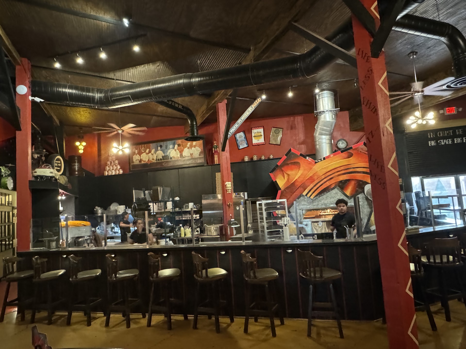 Now I do think the atmosphere there is probably phenomenal! There's a stage for live music. There are tons of interesting decor all around. The best feature to me is the monster pizza over in view.