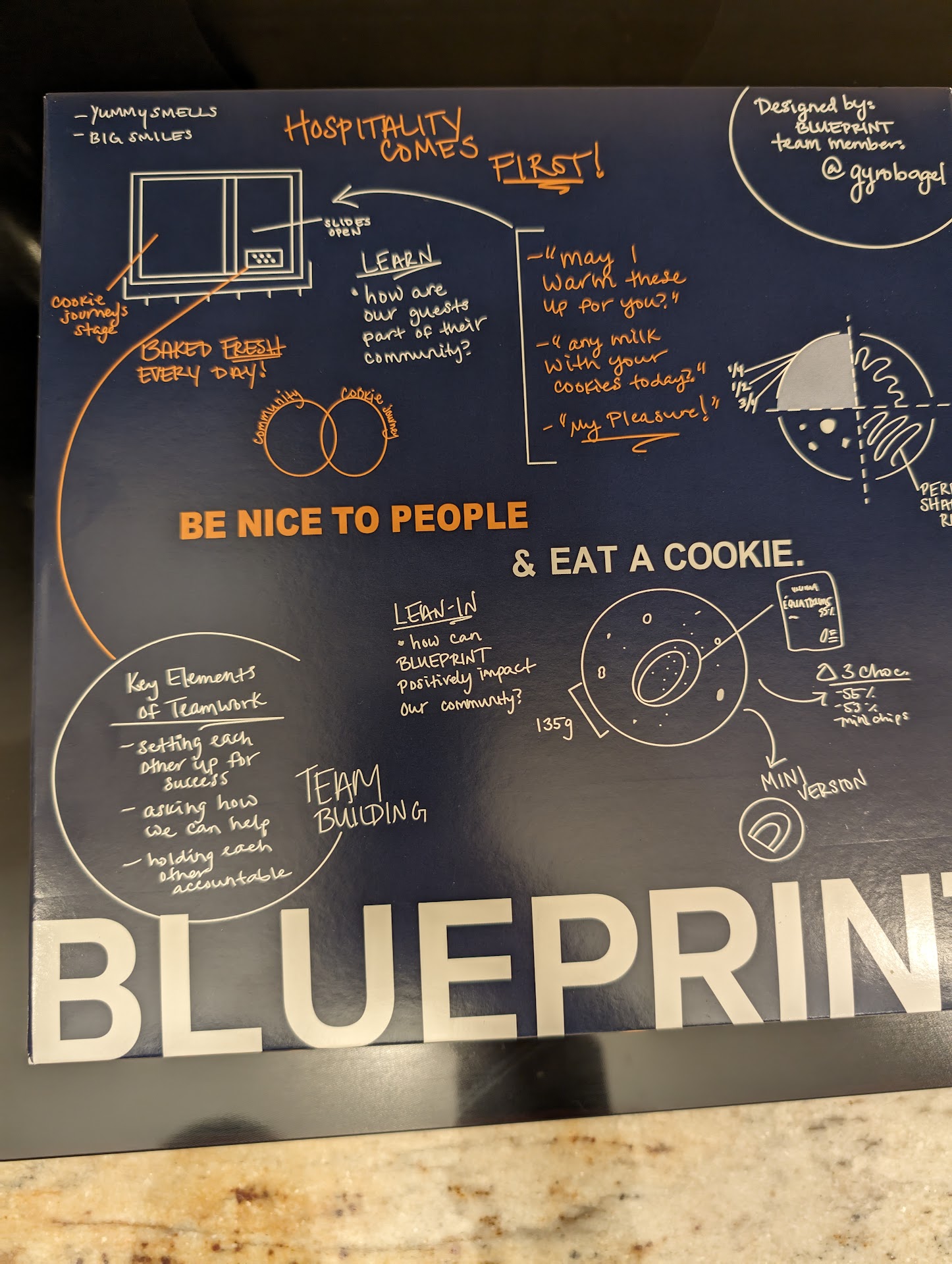 So we just visited the newest Blueprint Cookies. It was a small shop, just a place for a handful of people to stand and order. The cookies are all freshly baked, and they have both permanent, seasonal, and weekly cookie flavors.