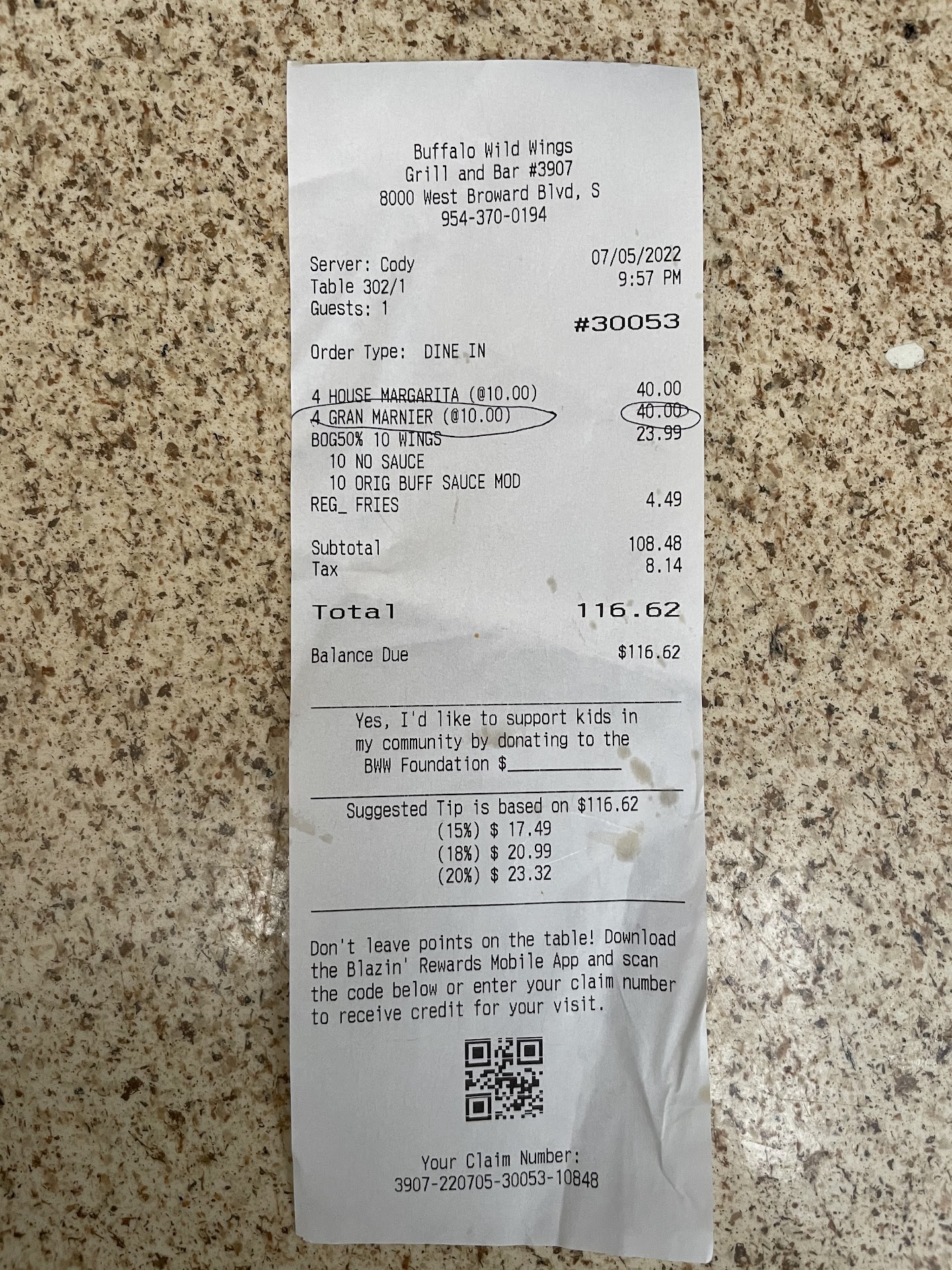 Ā Ā Ā Read moreDisappointed. Coming from Texas to this location. Went 4 separate times because the wings were good. The first time they were closed on a Monday for no apparent reason. The second time, there was a screen cover from a PHONE in my water cup wasnāt offered an apology or anything. Third time our beverages, wings, fries, and salads came at separate times and incredibly spaced out.. only saw two servers for the whole restaurant the service was terrible. The fourth time, we went back so that our friends could try the āblazināā wings so we went with a very large party. Two people in our party didnāt get their food till literally everyone was finished eating. There was a hair in the wings, we were brought supposedly āblazināā wings which werenāt even spicy (they werenāt the right wings.) Then our sever was going to clock out half way through our meal, asked for his tip which we gave him.. and he left so we got another server. Some people didnāt get the food they ordered at all, they tried to charge for the same beer at the bar and then again at the table.... long story short... they took orders and kept bringing our food without assigning it to anybody. We ended up paying $60 for unaccounted food that was āate by our tableā when most of our party had paid their part and left. The manager literally offered no apology for the bad service... for not properly dividing the food, or not informing us that it was going to be one big check... she only said āthis needs to be paidā over and over. And that if we didnāt pay it, she was going to have to call the cops when someone said we had paid for our food (which everyone still present already had) and that we were leaving. Wrote a long review because I still feel robbed and feel no customer service should ever be this way. We had money to pay our food, we all came with kids, we werenāt trying to steal food but we were treated like we were. Before we left I gathered ALL our plates and cups and tried to clean as much as possible because it was in fact a large party. Another server even thanked me for going out of my way to help. We were there to eat and have a good time not to take advantage of anybody. Donāt go...