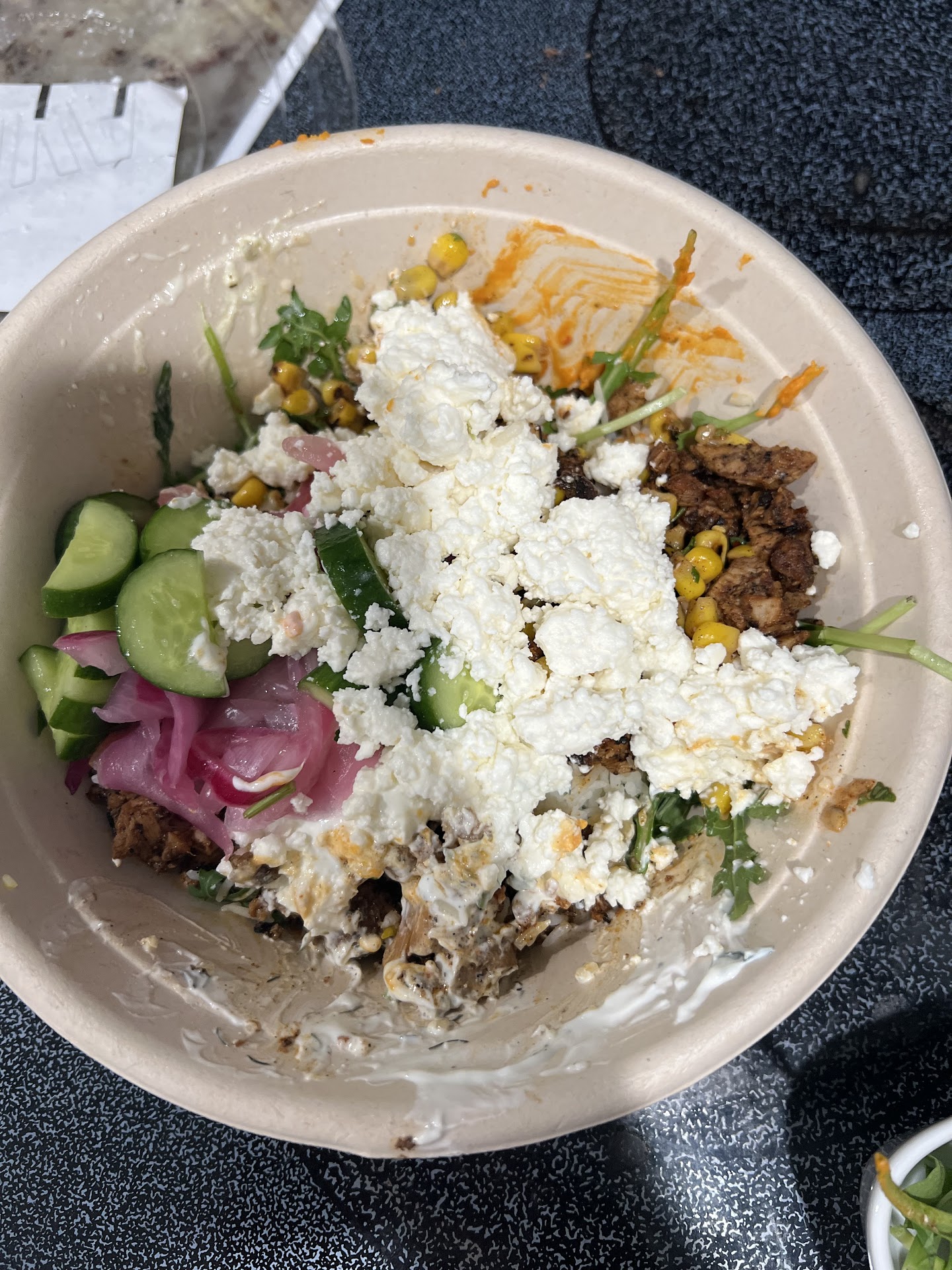 When I finally got to the counter, I ordered my base and main—so far, so good. Then we got to the toppings. I noticed the crumbled feta tray was nearly empty, just a few bits left. I asked for some anyway. Everything at Cava is better with feta, right?