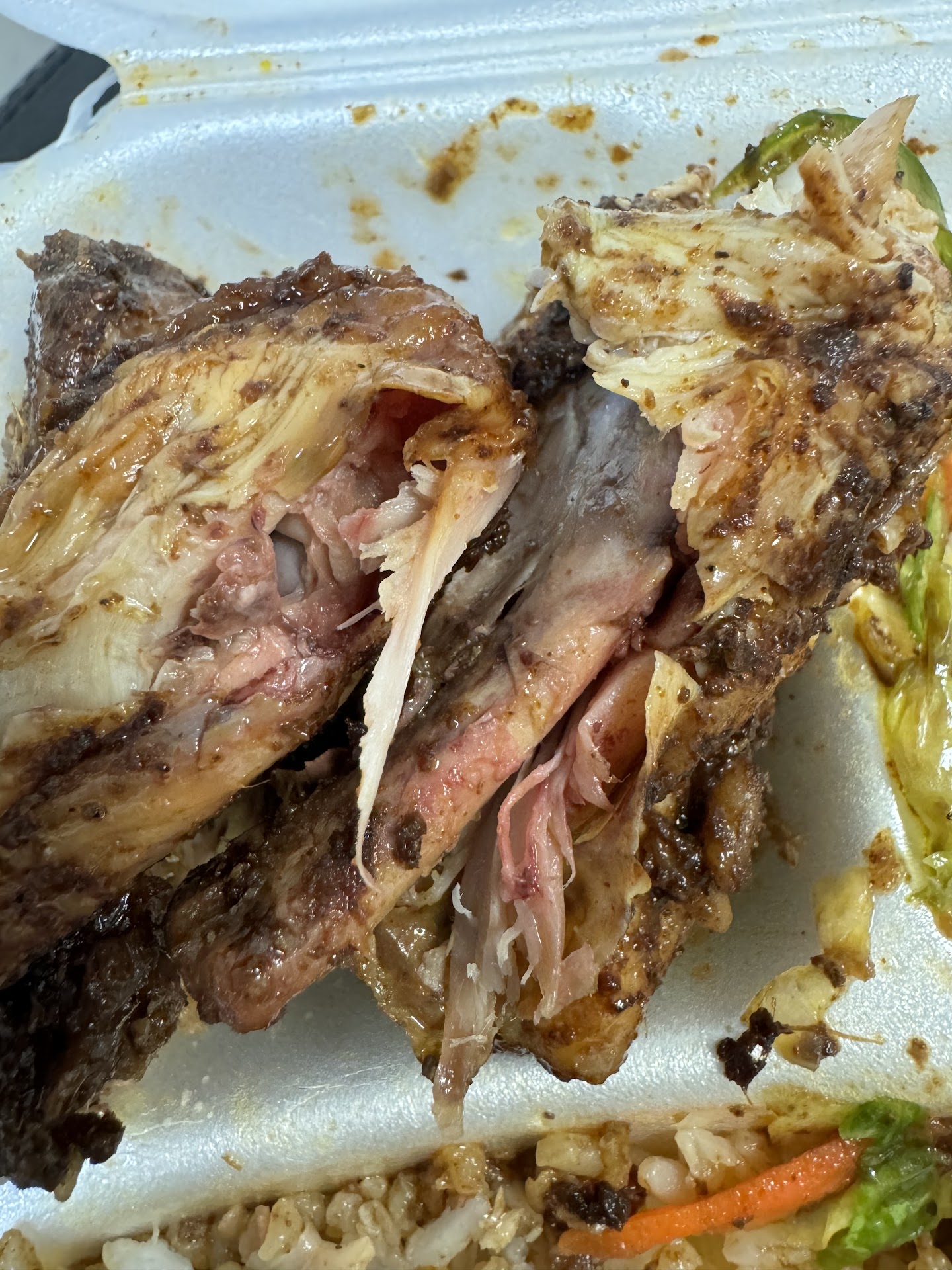 I went in Sunday, May 5 around 2 o’clock to grab food for my family. I ordered two small fried chicken, two small brown stew and a small jerk chicken meal. Totaling around $70. Once I reached home, my jerk chicken was not cooked and there was blood still coming out of the chicken.