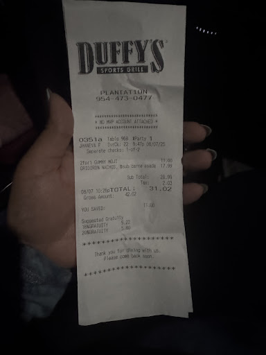 Nonetheless, we paid and left her 20% tip despite the lack of service - and on the way out I remembered they had given us an MVP card at the Duffys in West Palm Beach location the other day so I asked the girl in the front if that was something she could help with even though we had already paid and she said āno? You can do it before you pay or after you pay. Get your serverā so I replied oh thatās fine, no worries; next time. And my husband proceded to open the door for us to leave and she waived her hands at me rudely saying well now Iām gonna call your waiter so youāre gonna HAVE to wait for her and proceeded to shout āCamila Camila!ā I was in shock that she had such an attitude when we had clearly said it was fine and to disregard? We didnāt MAKE her call our waiter and were simply inquiring.