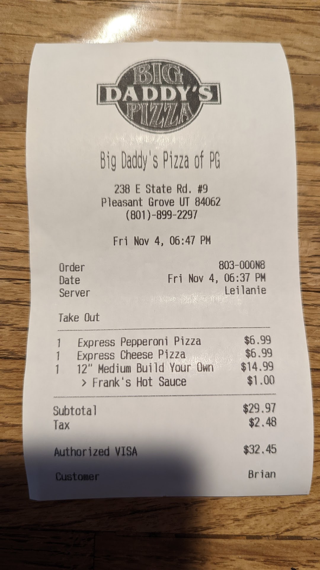 We've eaten Big Daddy's Pizza, nearly every Friday night, for the past 7 years. At one point a year or two ago I calculated out that we'd easily spent over $4500 at Big Daddy's since we'd discovered them. We've stuck with them through multiple workers and owners (Edwin and the Himilayan dude being the coolest by far). I've recommended them to just about everyone I've ever talked pizza with. They've been my go-to pizza place for years. They earned that spot with their prices, portions, and friendliness (though order accuracy wasn't always quite spot on).
