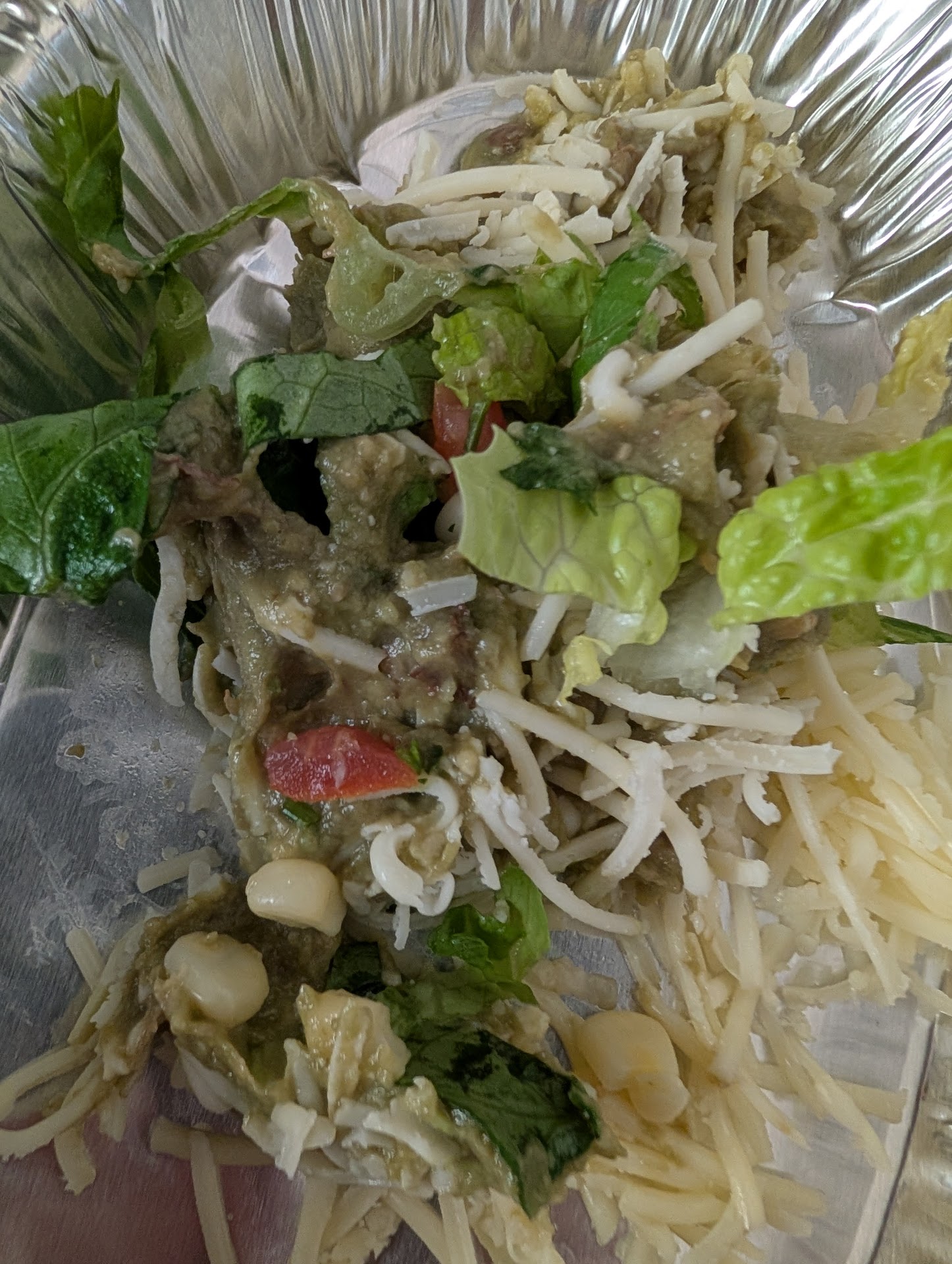 We get to the atrocious veggie station. The lettuce looked very unappetizing, so I just asked for hot salsa and cheese. After asking for it, I took a look at the salsas and noticed each one of them looked like a paste. Not salsa. Like tomato paste consistency. Alright, fine it's just dried out salsa hopefully it still tastes okay. The cheese looked like plastic, so I asked her to just forget the cheese. No guac, no queso, so I can't comment on it as I wasn't look at that.
