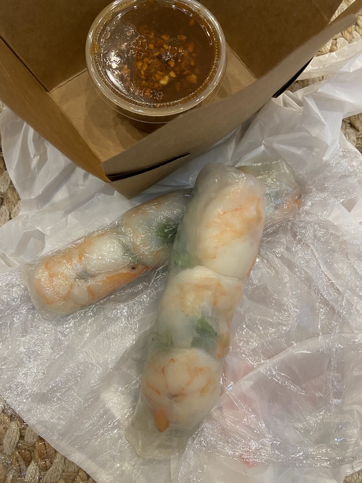 Price: shrimp spring rolls, small bowl of soup, and ice water, I spent over $20 with tip for lunch.