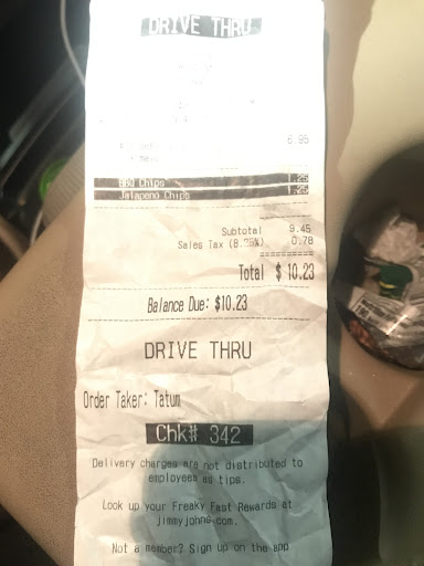 Read moreI was ordering in the store for a to go order and the cashier asked me what I wanted and mid order she literally turned away from me to talk to a someone in the lobby. Then she turned back to me and asked me to repeat myself. There were probably around 10 employees running around everywhere. It was absolute chaos. Also no one called my order out when it was done. The pick up counter to grab my food was way the hell in the back. They need to take names or give you a number to call out your order. Very unorganized. I'm never walking in there ever again. Also. My place of business is literally 2 mins away from the Jimmy John's and when they deliver they always take close to 20 mins. Idk what they are doing but they obviously don't have a clue how to do their job. Me being a delivery person I know exactly how long it takes me to get from place to place. I have no idea what takes them that long. Especially since I've ordered delivery so much that they know exactly were to go. I'm very...