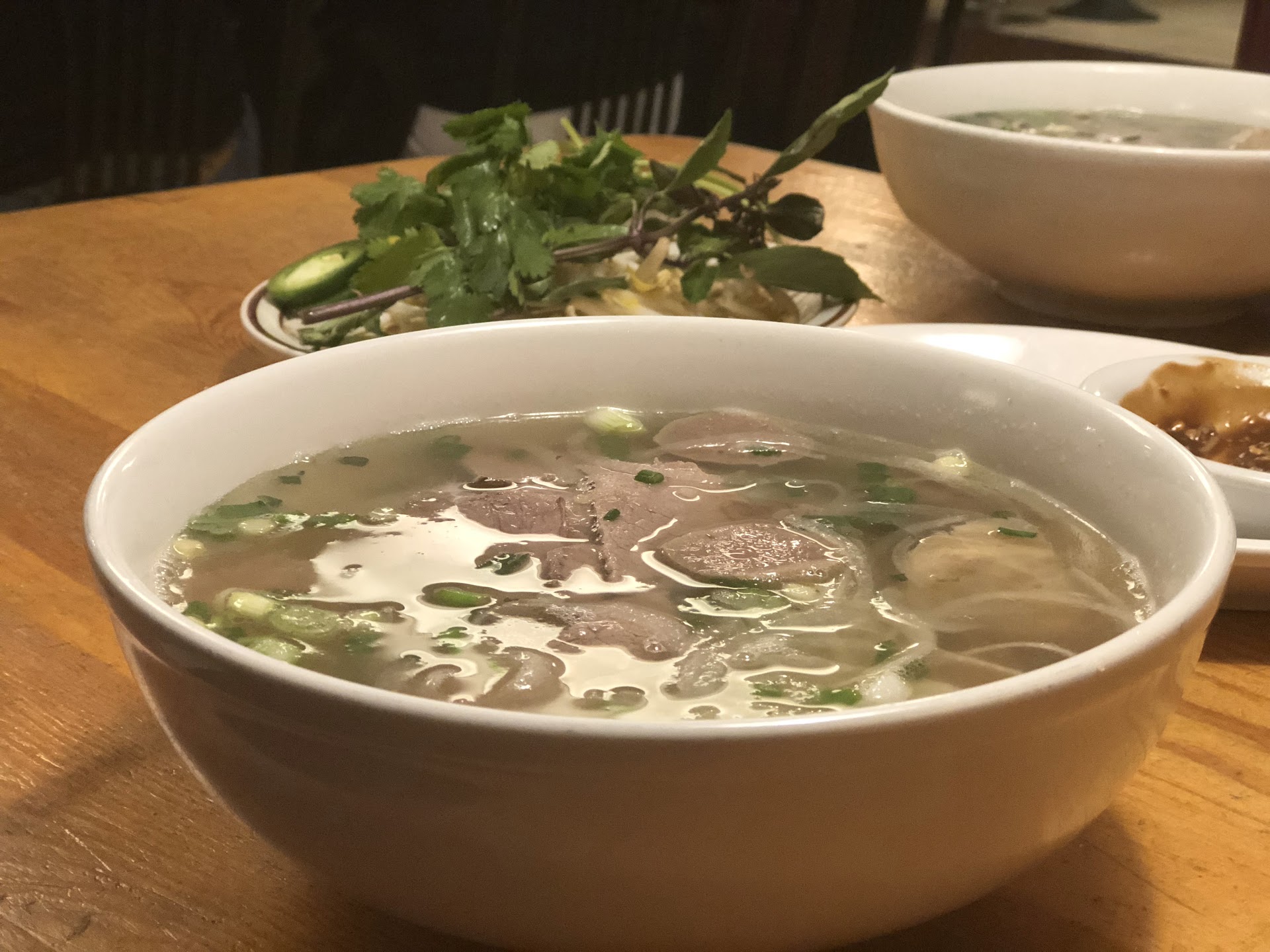 The pho was extremely flavorful and really tasty. I didn't really care for the meatballs as they were rubbery and didn't taste fresh.