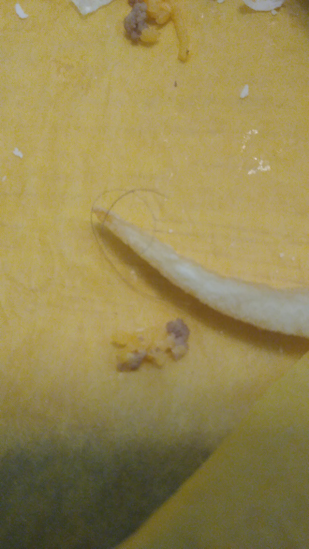 10/2022 Went through the drive thru today. It moved along quickly. While eating my fries, I found this black curly hair. I'm a female red head, no black hair here. Completely lost...