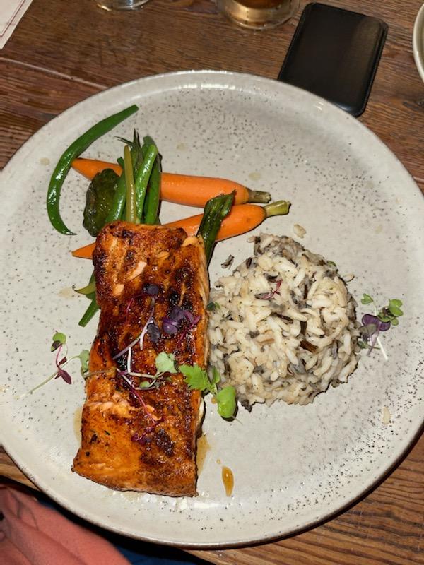 We had salmon, which was very nice but the fish was pretty small and slightly over cooked. Also a salad with chicken added. The chicken was also small and a bit dry. 8 suspect the fish and chicken might have been cooked, frozen and then recooked/finished.