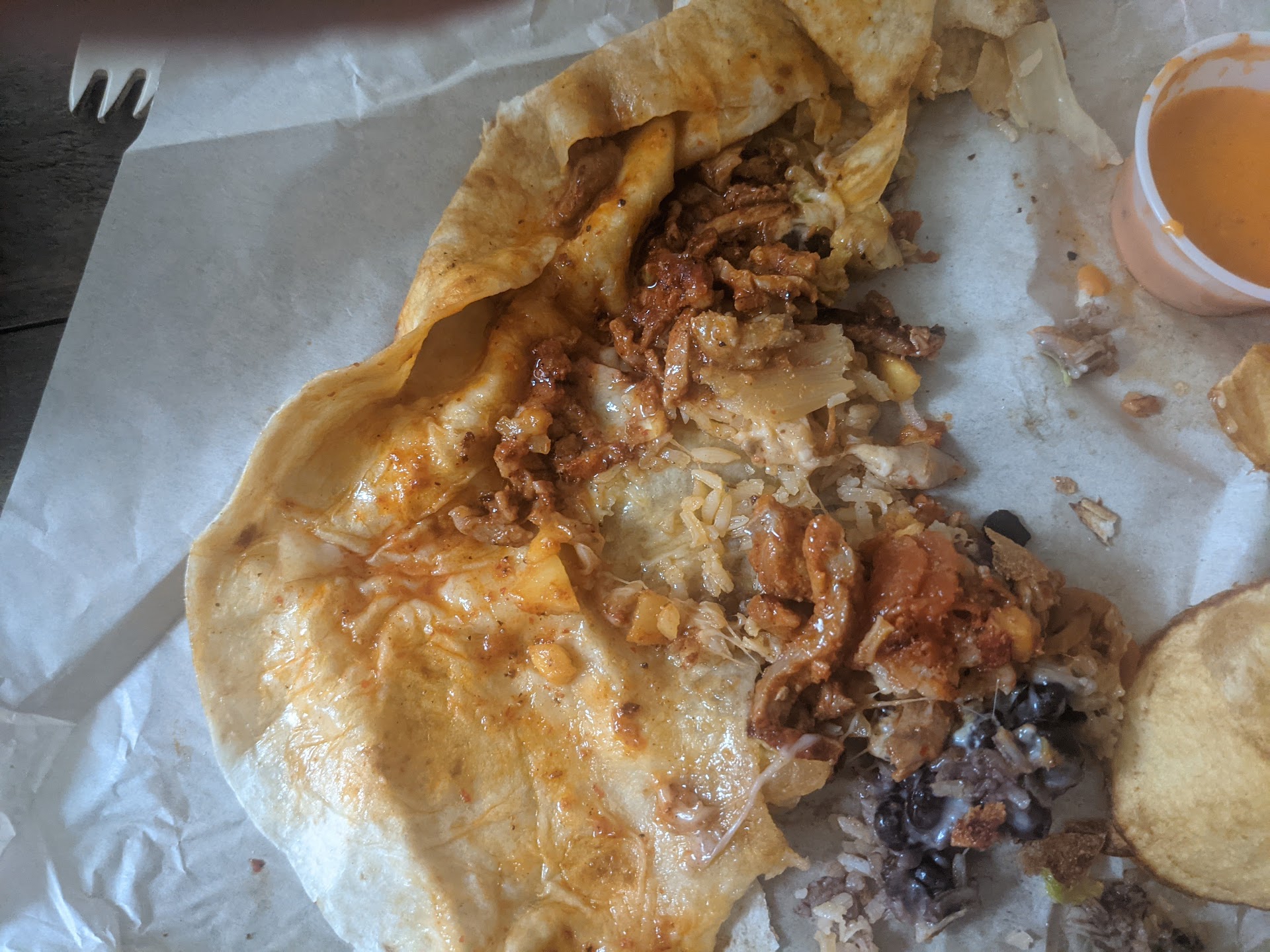 I peeled open the burrito and at the VERY END there were just a couple little pieces of meat. I guess my accidental order switch hypothesis was incorrect. My wife gave up and walked away from her food half way through.
