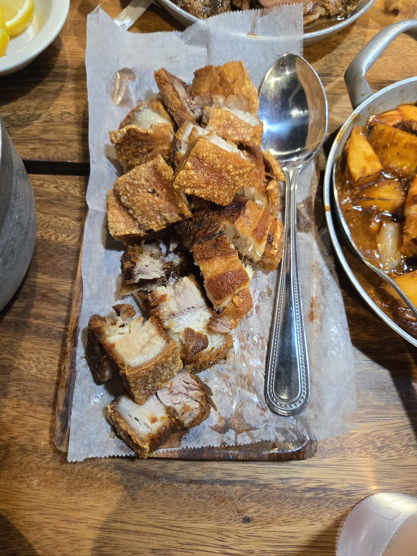 We opted for the boodle fight style, a communal dining experience that's both fun and immersive. The kawali lechon was a standout, with its crispy skin and flavorful meat, satisfying any craving for this Filipino classic. Another favorite was the bisket brisket, rich in flavor and perfectly complemented by the sweetness of caramelized onions.