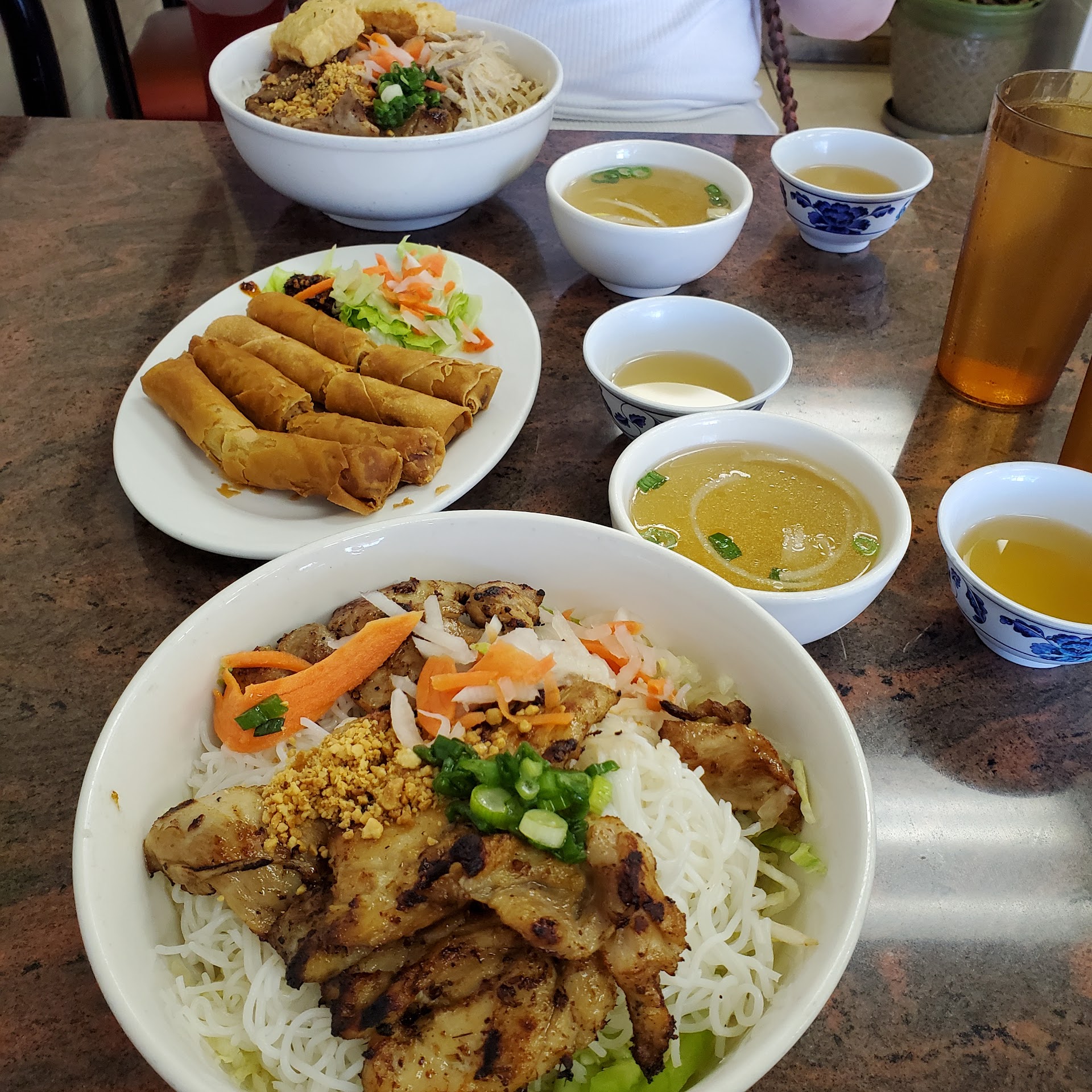 Read moreWow okay. Where to start. I came in with a friend for lunch before realizing we were running short on time and having to leave with our food in to go boxes. We walked in and the lady who sat us and took our drink/food order was really kind of... terse? I ordered chicken bún as it's what I usually get. I order it semi-regularly from various locations so I'm used to having a good, filling meal from it. I ended up being super busy so I haven't actually finished my food yet after taking the majority of it to go but when it arrived to the table and I dug in, the noodles were... hard? Vermicelli noodles aren't supposed to be hard for bún. It was like they were al dente. They were also like clumped together where it was the densest. My friend said maybe they were made from packets of noodles and steamed improperly. The noodles were no bueno. The chicken tasted good and was cooked great. I had a huge chunk of gristle but I have that kind of luck so I just put that bit to the side. The man behind the cash register was super nice! He let us pay separately without issue. Oh and my honeydew smoothie was the best part of the entire experience. If you go, order one of those and don't...
