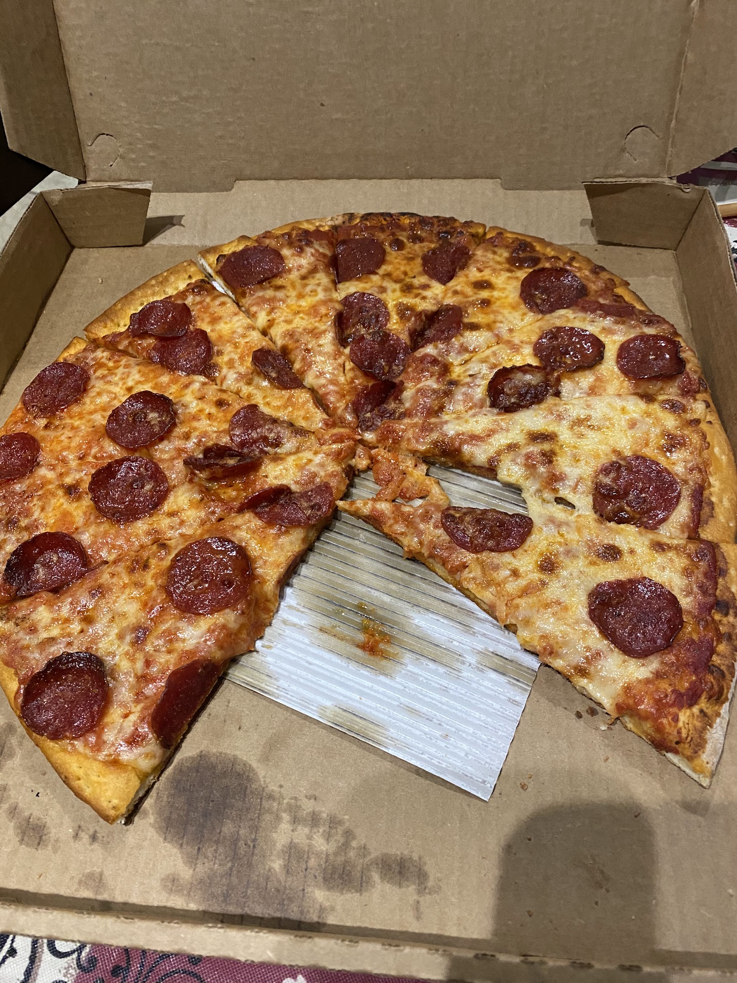 I guess the person making the pizza was in a hurry because our pizza was really undercooked. Really, really doughy inside. It took 75 minutes to get to us, and arrived hot, so that couldn't be all Eat 24's fault. I liked the sauce on the pizza but we only each ate one piece. The wings were really fatty and too spicy for my husband. We were really disappointed.