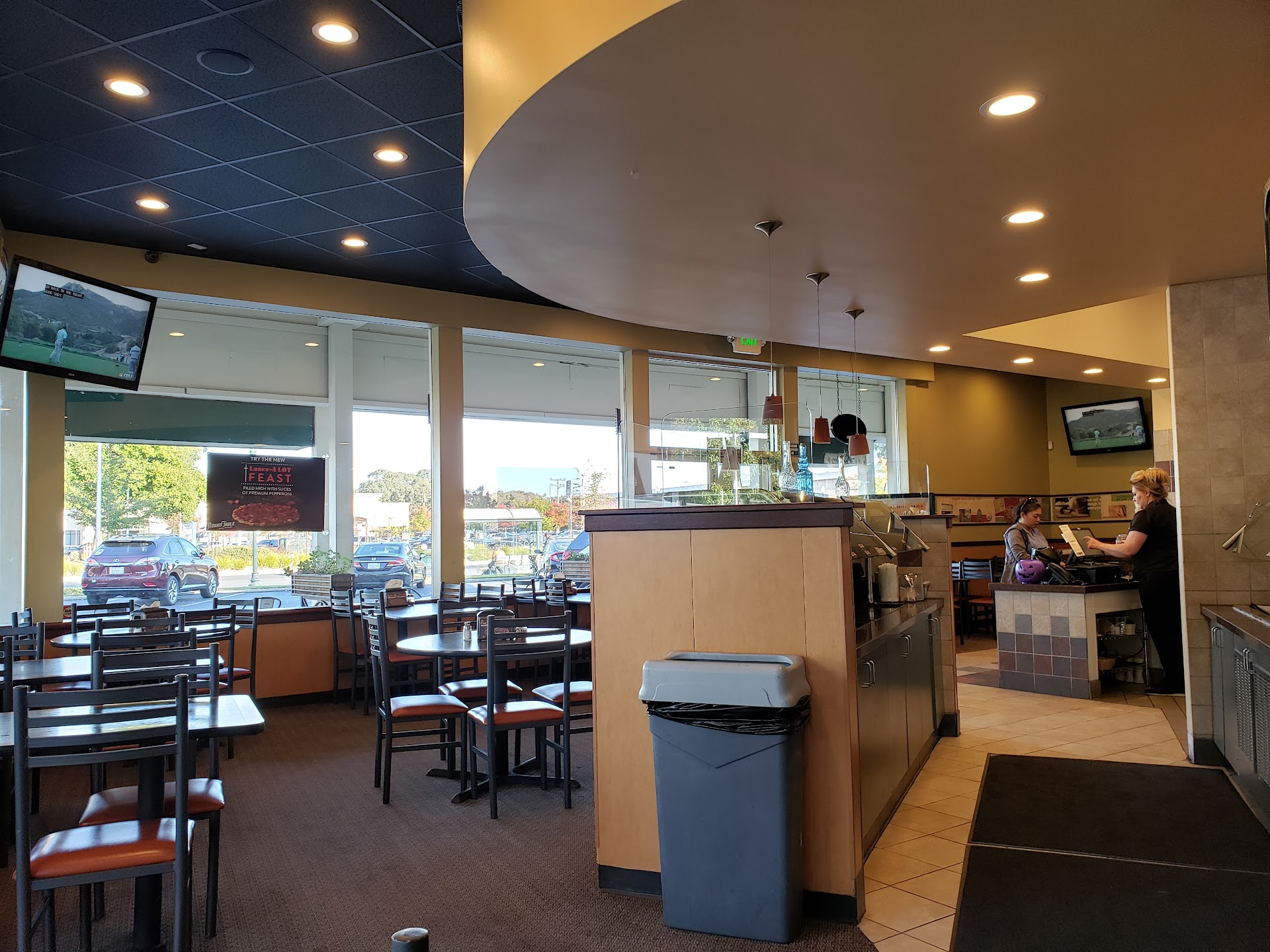 I am Never Disappointed here. Anything I ask for, they are very happy to please. They have multiple large flat screen televisions. They have a salad bar, even though I have been too happy and full to visit. Bathrooms are always clean. There are other games and stuff for kids to do, so bring extra quarters. The staff is all very attentive and friendly. My family orders a large, half king Aurther and half meat lovers. The pizzas are always great, and ordering on the phone is a breeze, before I pick up. I really don't know why more people do not dine out here. I would. I DO, every chance I have. Lots of room and seating. They really give the place a good scrubbing once a week I noticed, because I walk by on my way to stater brothers couple days a week. If you have company, extra family visiting,I highly recommend going here for great food and room to relax. Maybe watch a football or soccer game.. Get out of the house if your going...