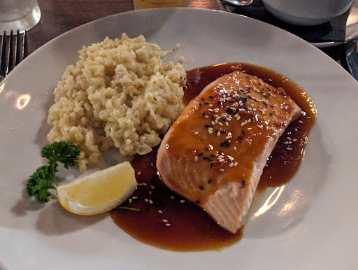 Read moreI was pleasantly surprised by 7 twelve. The main reason why I'm giving 4 stars is because parking is valet only and it would be nice to have a choice; especially because it's not a restaurant that I would exactly consider high end although higher end than many. We had a reservation and we got seated immediately. When we went on a Saturday at 6pm, it was probably at half capacity but it got busy soon after. The atmosphere could be described as sophisticated but not pretentious. The bar is the main feature and I love the light on the liquor shelves, very dramatic. The walks are a dark blue and a dusty light blue I think, the lights were dim and I think they dimmed them even more as the evening progressed. Our server was very professional and the staff is clearly well trained. The food was good. The salmon was cooked perfectly and the glazed paired beautifully with it. The herb risotto was delicate and light. My husband got a medium rare stake, they make sure you cut into it and are satisfied with it and it looked perfect but when he got to the thicker part it was rare leaning on blue, which is how I eat it but not my husband's preference. The taste though was delicious and so was the chowder and the vegetables dou jour that that day were baby carrots. They have a decent selection of local beers and the feature cocktails are good. The 712 Smash was absolutely delicious. Prices might be considered high but honestly the food is so good that it's...