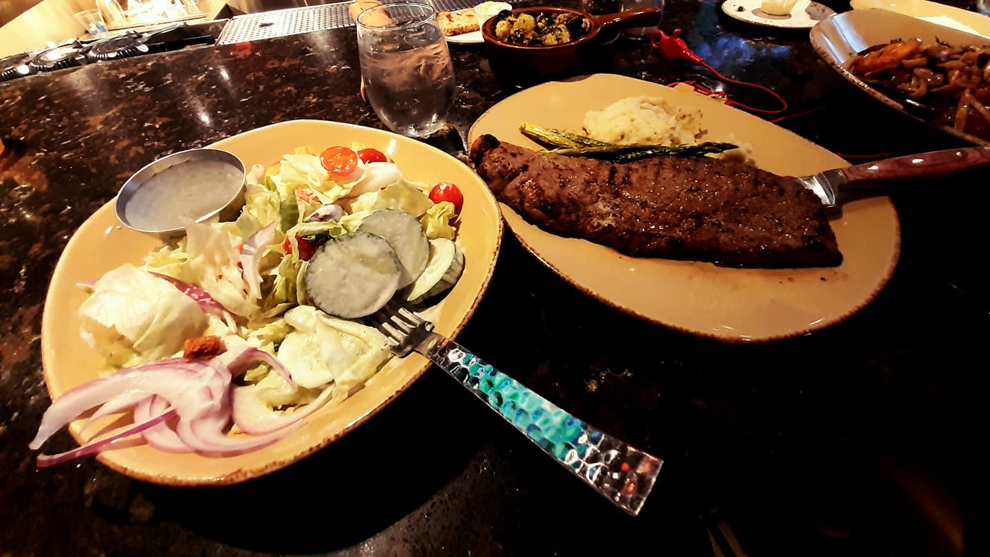 French onion soup had minimal flavor, shrimp cocktail was good (4 shrimp for $15, despite menu saying $14), side salad was underwhelming (would have chosen another side had we known it was so basic & small), ribs were good (yay), sirloin was chewy (but edible), both loaded baked potatoes were dried out (didn't taste fresh despite having a reservation when they opened), and filet mignon was tough & chewy. I LOVE steak and simply couldnt eat it. I ended up sending it back. After reading reviews (while there), I saw I wasn't the only one with issues (sort on most recent) I had regrets that I'd booked this place. Overall, meat wasn't good quality and/or cooked properly. I actually question if it was frozen and unthawed improperly. No manager came by to inquiry or apologize (which is what well run establishments do). However, Lee our server was pleasant, and did take it off the bill.