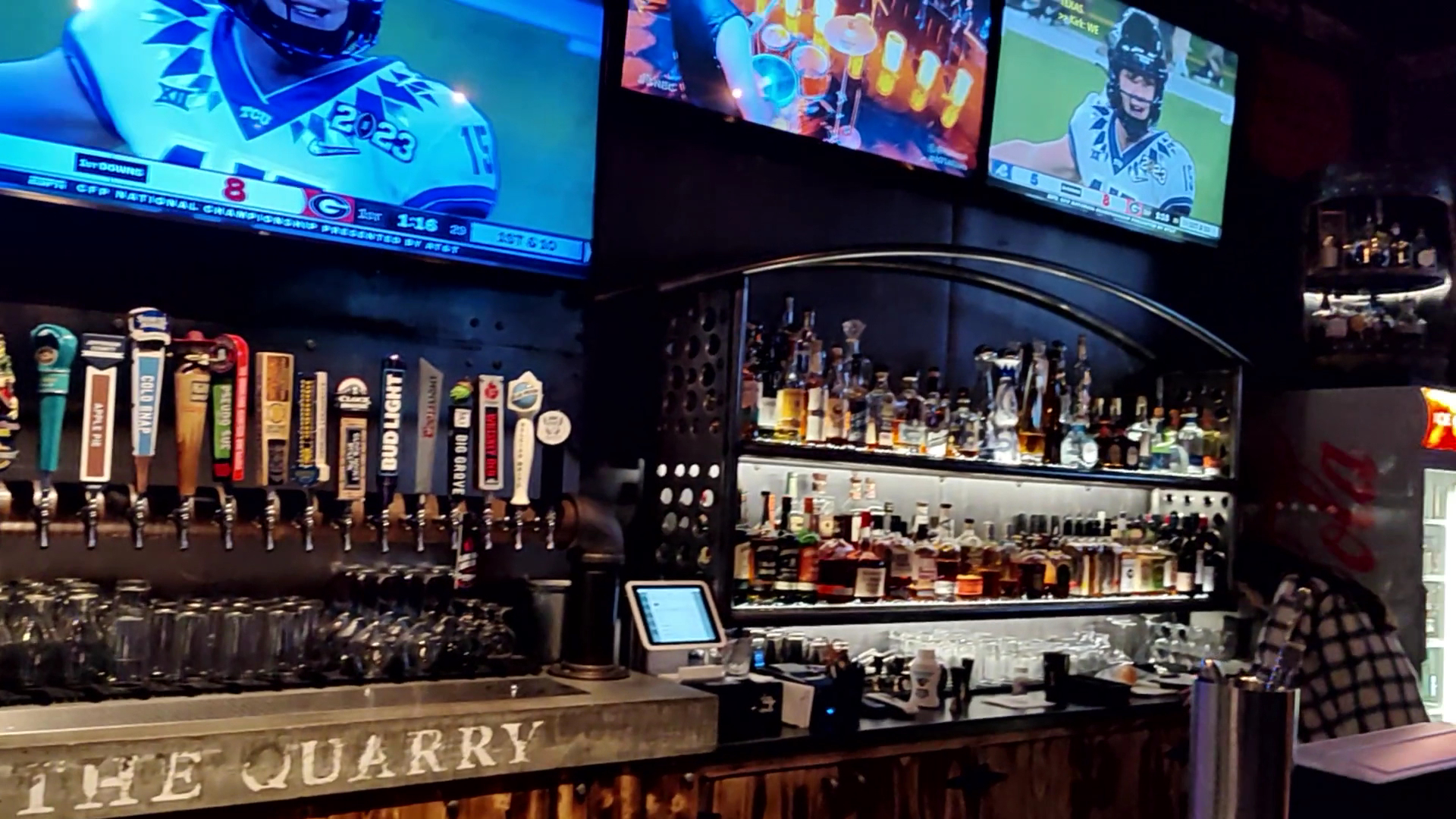 The most notable thing about the space, besides the clean and new appearance, is its low lighting. There are a few small accent lights near the tops of fake pillars, what appears to be a haphazard cluster of three lights in one corner over a table, and suspended fixtures over the bar consisting of a double layer of metallic mesh surrounding their bulb. Every light in the space was either incandescent or stylized as such. Combined with whatever light came from the 10 large flat screen TVs, the space is decidedly comfortably lit.