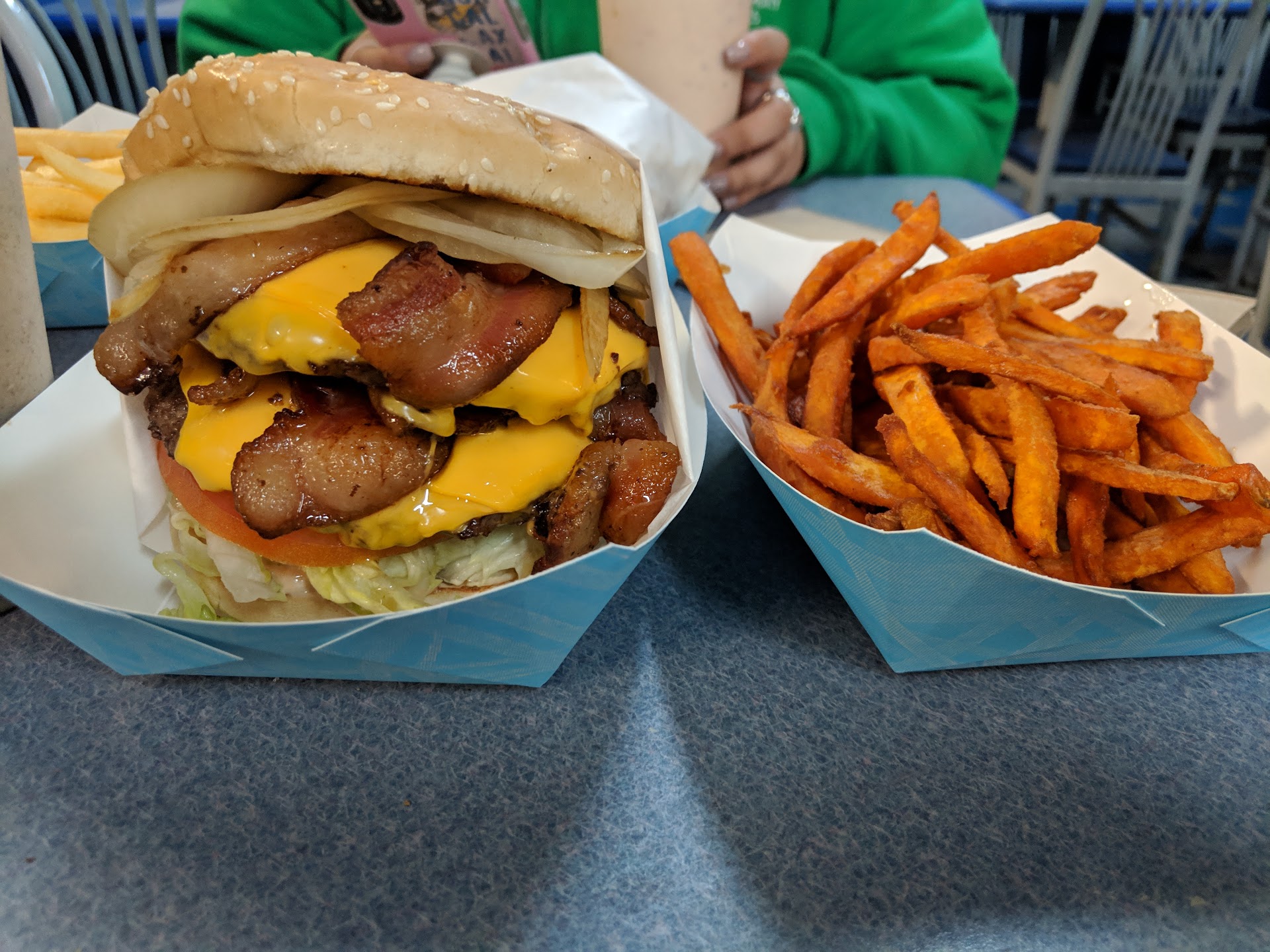 Read moreMy friend and I have never been here and we both love burgers. We came here on a Friday afternoon before the school kids got out. I ordered a bacon burger with garlic fries, and a nutter butter milkshake, and my friend got a cheeseburger with fries, and a butterfinger milkshake. The burgers were definitely big but the meat lacked seasoning. The burgers were stuffed with lettuce, onion, pickles and tomatoes. I want to say I love lettuce but the burger had way too much lettuce. The burger also did not have enough special sauce so it was kinda dry despite the extra salad. To their credit they did give me a good portion of thick bacon which I appreciated. Both regular and garlic fries were okay; they also did not salt or season the fries. I did like the garlic, parsley, and cheese in my fries. The milkshake were excellent though; very rich and creamy. Overall, a nice little local place to grab a decent burger and shake, but for the value, I think you get better...