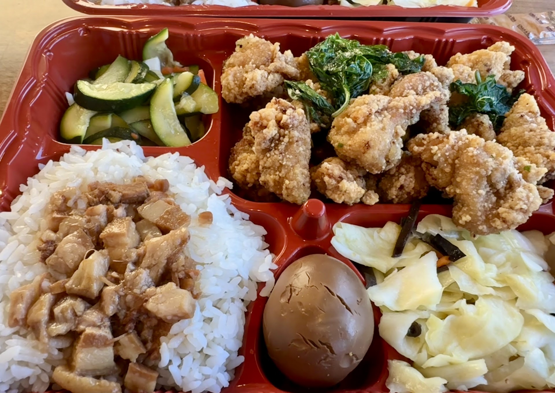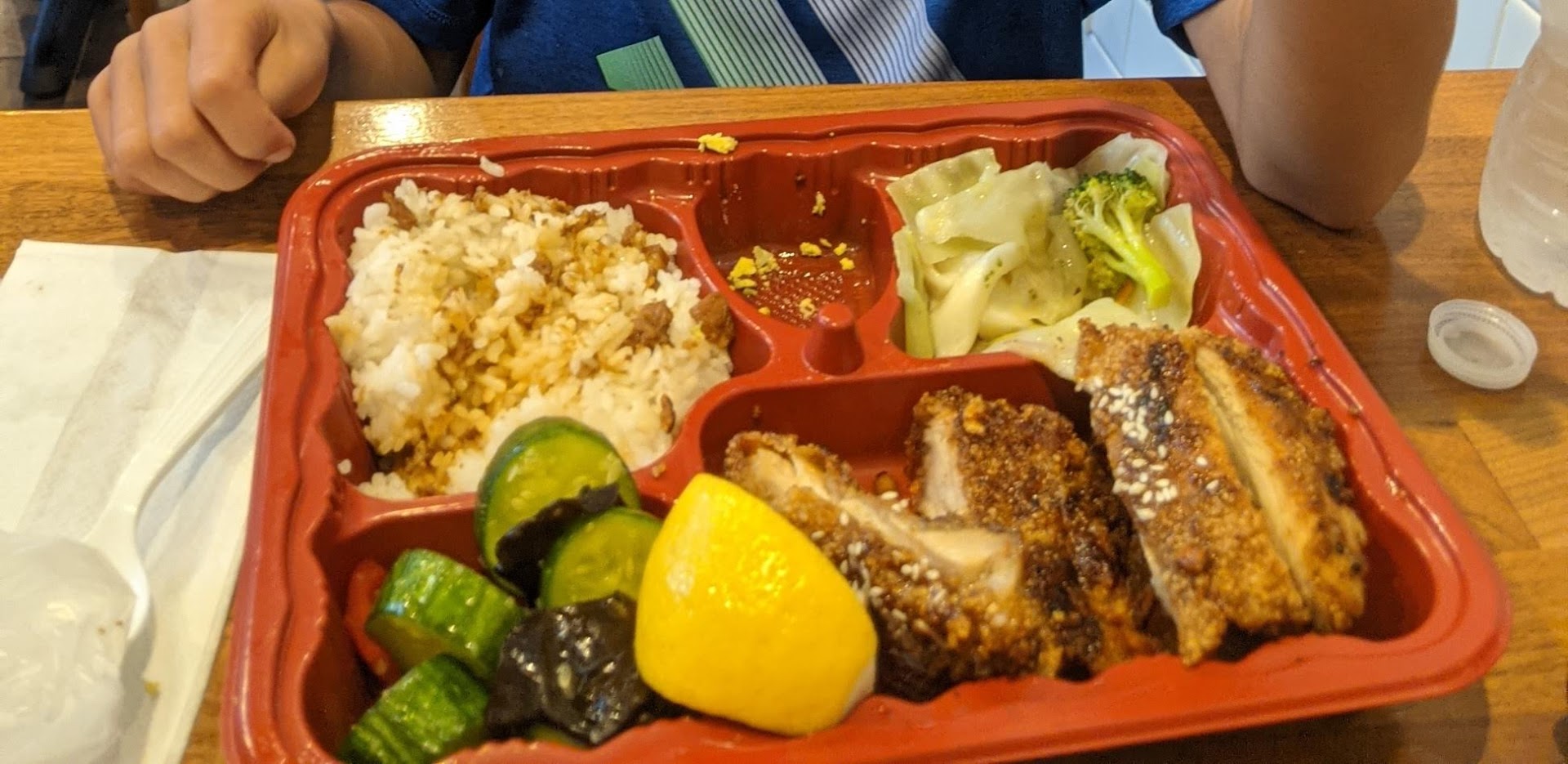 The chicken bento was dynamiteâ2 large cutlets in sweet 5 spice marinade. Then deep fried. The rice had minced pork belly sauce. The veggies were good. Portion was very large. There were leftovers