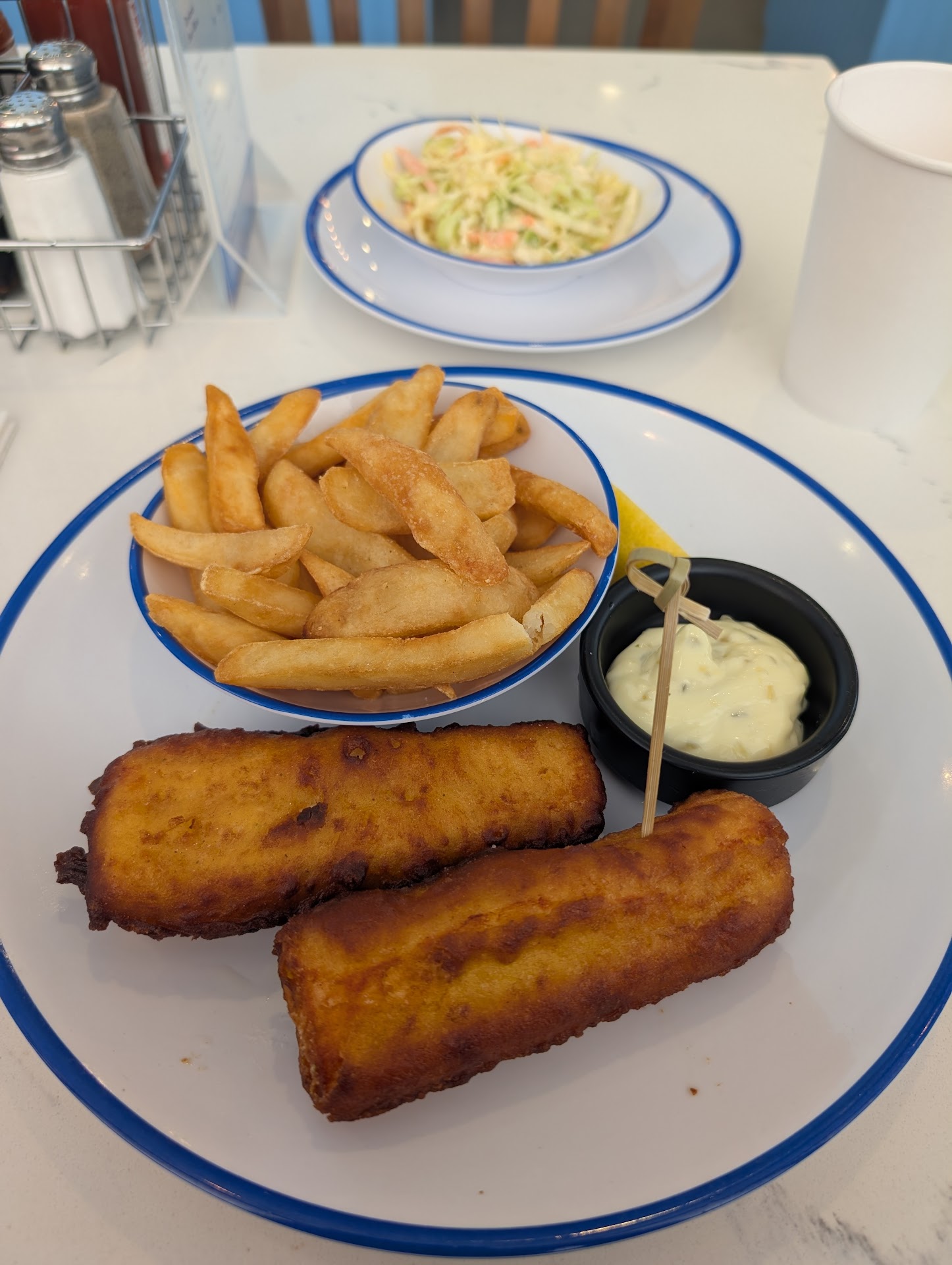 Cons: I ordered the two piece fish and chips with one piece of cod and one halibut. I also ordered an 8 ounce serving of cole slaw. The chips were cooked well but lacked any kind of seasoning. The halibut was dense and immensely dry. I know halibut is a lean fish but it was like eating a brick of fish. The cod was marginally better. I did like the batter which had a great crunch, but that was not enough to save the tragedy of the fish. The cole slaw was seasoned well but too watery and soggy. They also gave the tiniest portion of tartar sauce. For the price I could have gotten better fish and chips elsewhere honestly.