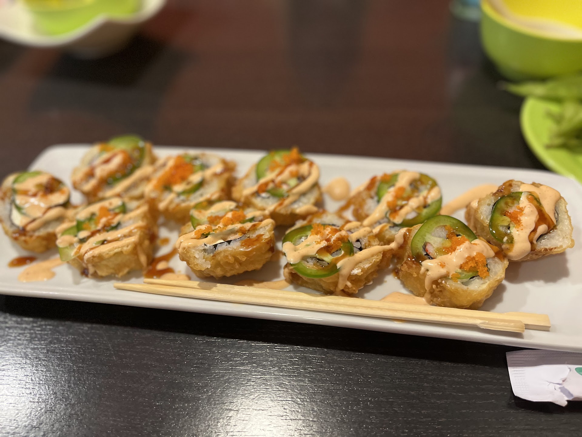 The atmosphere is very welcoming, and the staff are friendly and accommodating. I came back here recently with a friend because we had a serious craving for sushi. I had a veggie roll and inari. The veggie roll had avocado, seaweed, egg, and cucumber. It was quite filling. My friend ended up devouring two rolls, so I know she liked it.