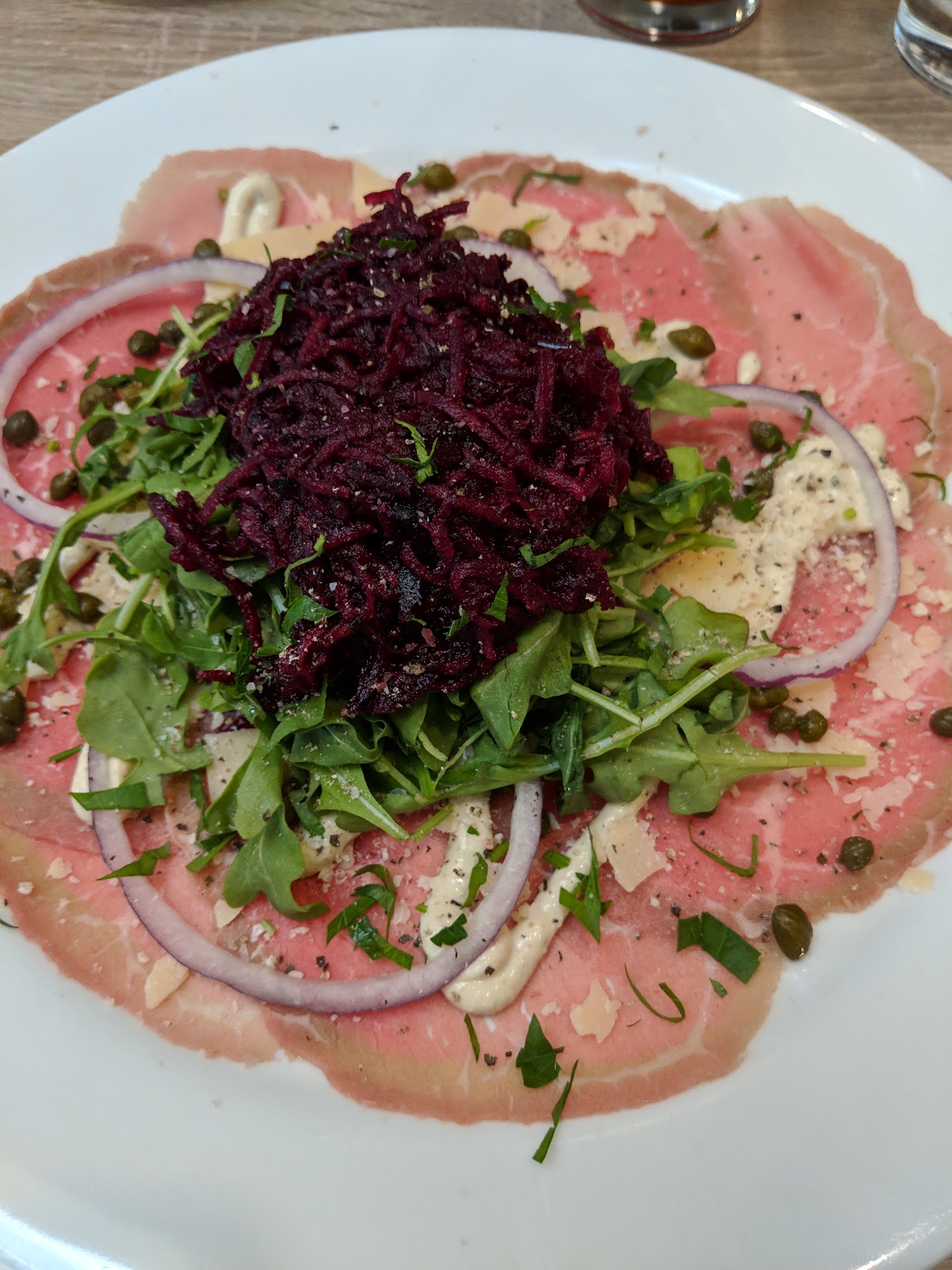 I thoroughly enjoyed my meal, the service, and was in and out in half an hour. I was able to park on the street only a few car lengths away. There was a bar and a considerable selection of wines and beer. There were interesting menu items that I will consider in the future, including multiple seafood options. I will definitely order the carpaccio for lunch again as I was fully satisfied with the amount of salad and protein...