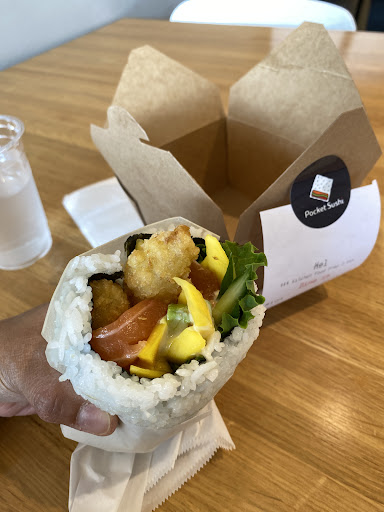 I'm floored at how good this place is. For a fair price, you get a greatly sized sushi hand wrap made fresh. The first time I tried this place, I had the poke pocket, which tasted amazing and had a great savory and sweet flavor and perfect balance of texture and rice. The second time I tried the red dragon without eel (not a fan) and it too, was incredible. The open water cups for water make this place a healthy and affordable option for if you want sushi but don't just want little bites for lunch. My boyfriend and brother got the spam and egg pocket and the California pocket respectively the first time, both reporting excellent flavors, and the second time, my brother grabbed the hot pocket. If you don't mind a little kick, out of all the pockets I tried, I think the hot pocket is the best. My boyfriend went for the Osaka fries and popcorn chicken. While I'm not a fan of bonito flakes, both my bf and bro said they taste amazing and would get them again. The popcorn chicken? We all agreed we would pass on next time: they were like mini chicken nuggets, unseasoned or very lightly seasoned. Despite this, I crave this place pretty regularly and will pop in when in town. I hope this...