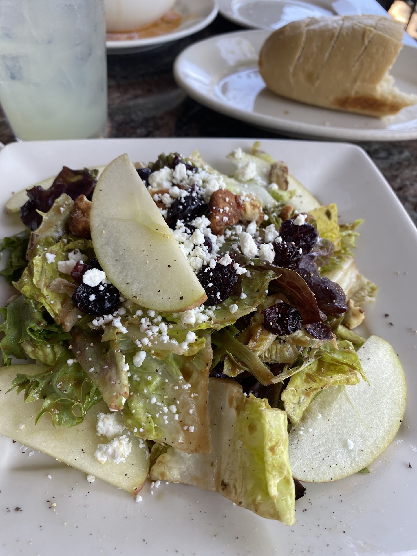 When he came back with our drinks, I ordered Fuji apple walnut salad and the seafood fettuccine from the light dinning combo menu and my friend ordered the full size minestrone soup and the grilled shrimp cob. Our first course soup and salad were so good, I wish I would have gotten two orders so I could take one home with me. For our second course, my friend raved about her salad and I was so happy with my entree. The portions were great size and I ended up taking about half my fettuccini home and happily enjoyed for lunch the next day as well.