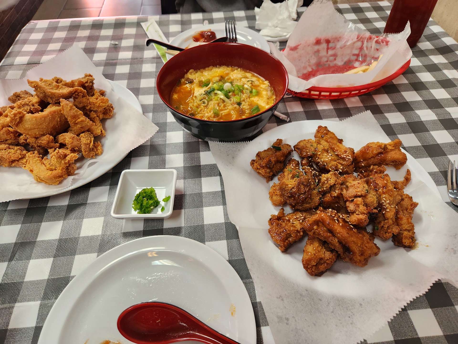 Read moreThis is my first time trying Korean fried chicken. It's crisp on the outside, moist and tender on the inside and flavorful. I like how combo (wing and legs) is an option. I also tried the rice cake and sausage snack. Very flavorful. The food is good. I haven't branched out to all the other Korean fried chicken places nearby though. As for customer service, it's a 2-person show running the place and everything is made to order, so there could be a slight wait. I recommend you ordering online. I'd be interested to come back to try their spicy menu items. Oh yes, it's just a tad pricey but I feel like Korean food in general tends to...