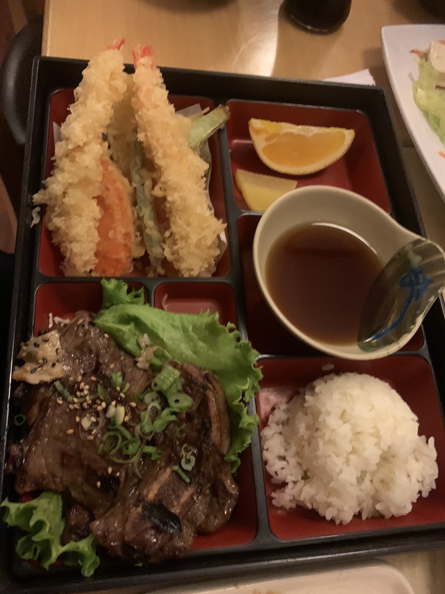 Food: 2/5 Ordered hot tea and the tea was basically just hot water, not brewed well, and the tea cups smelled like bleach. We all ordered bentos and all the meats were tough, dry, tasted odd. There were a few other rolls and they were decent.