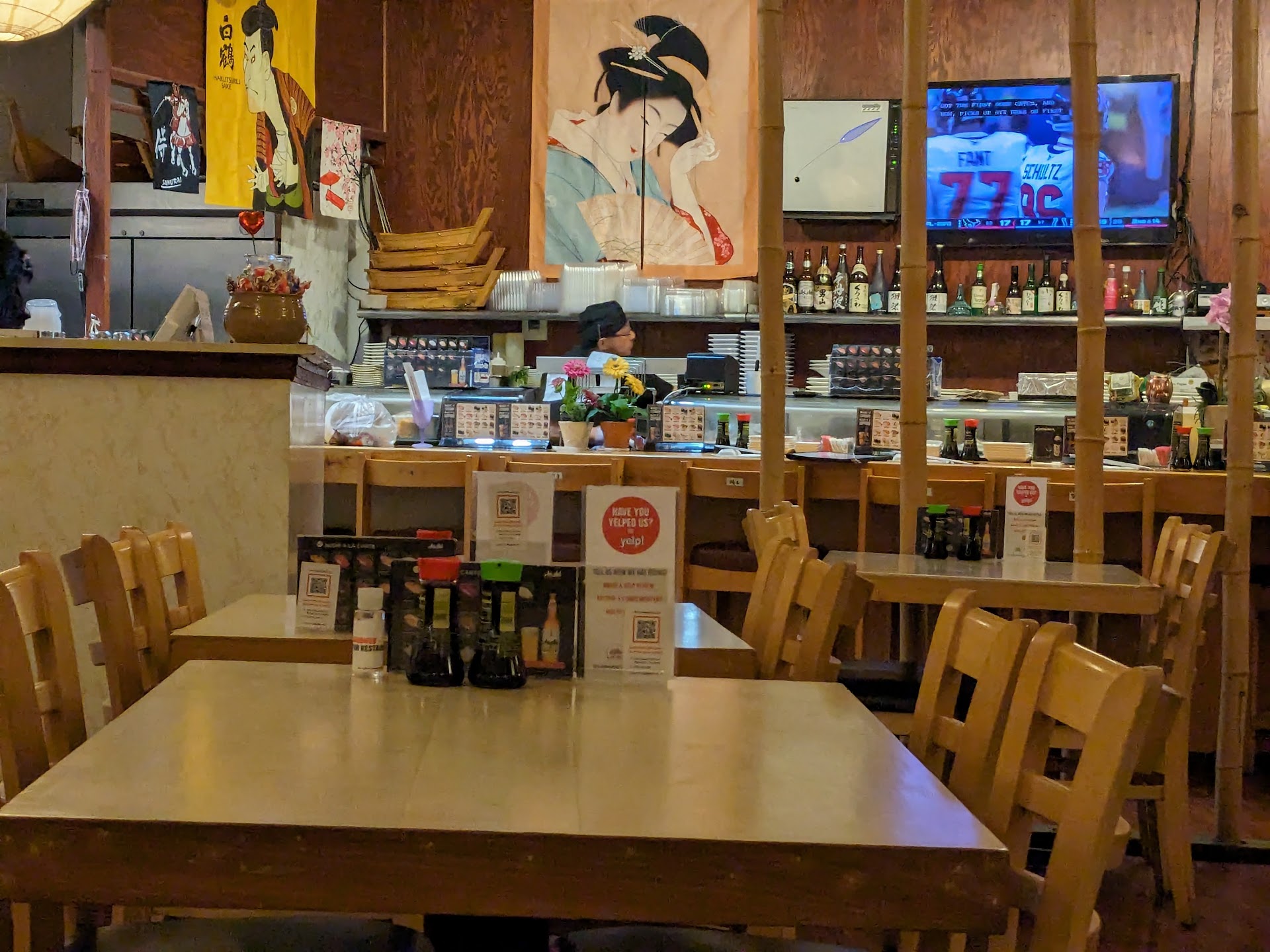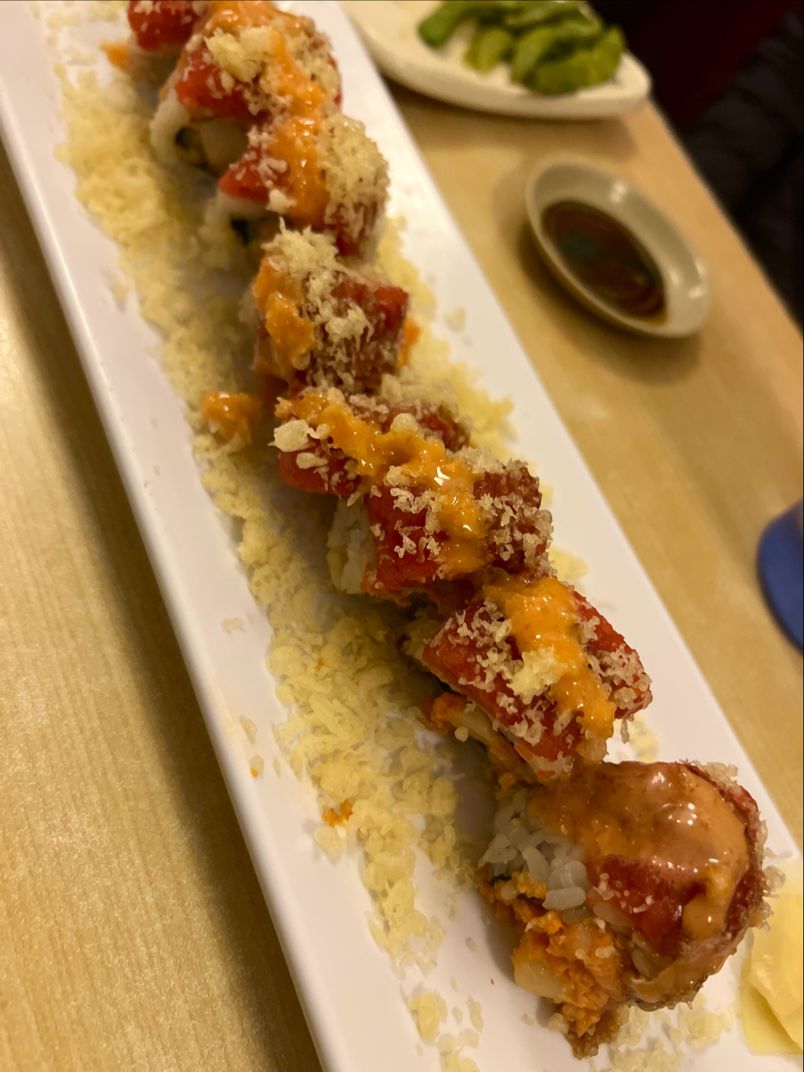 8/4/25 Godzilla! w spicy crab meat. Tame but VERY good Inside avocado and crab nicely chilled. Not many do that. Love it when the avocado is nice and cold as a contrast Partner has orange blossom and we got edamame. Lot of good food but could use some more visitors. Update, Godzilla! Spicy enough to make my forehead sweat. Not so tame after all Safety note. The lighting really sucks and you should keep your eyes down towards the ground because you might just slip off the curb like I did and I ended up with a bruised hand and a bruised knee. Fortunately I work out so I have a lot of muscle in the palm and didn't break that area which apparently is easy to do. The shopping center needs to put safety tape or safety whatever at the curbside just to alert people at night
