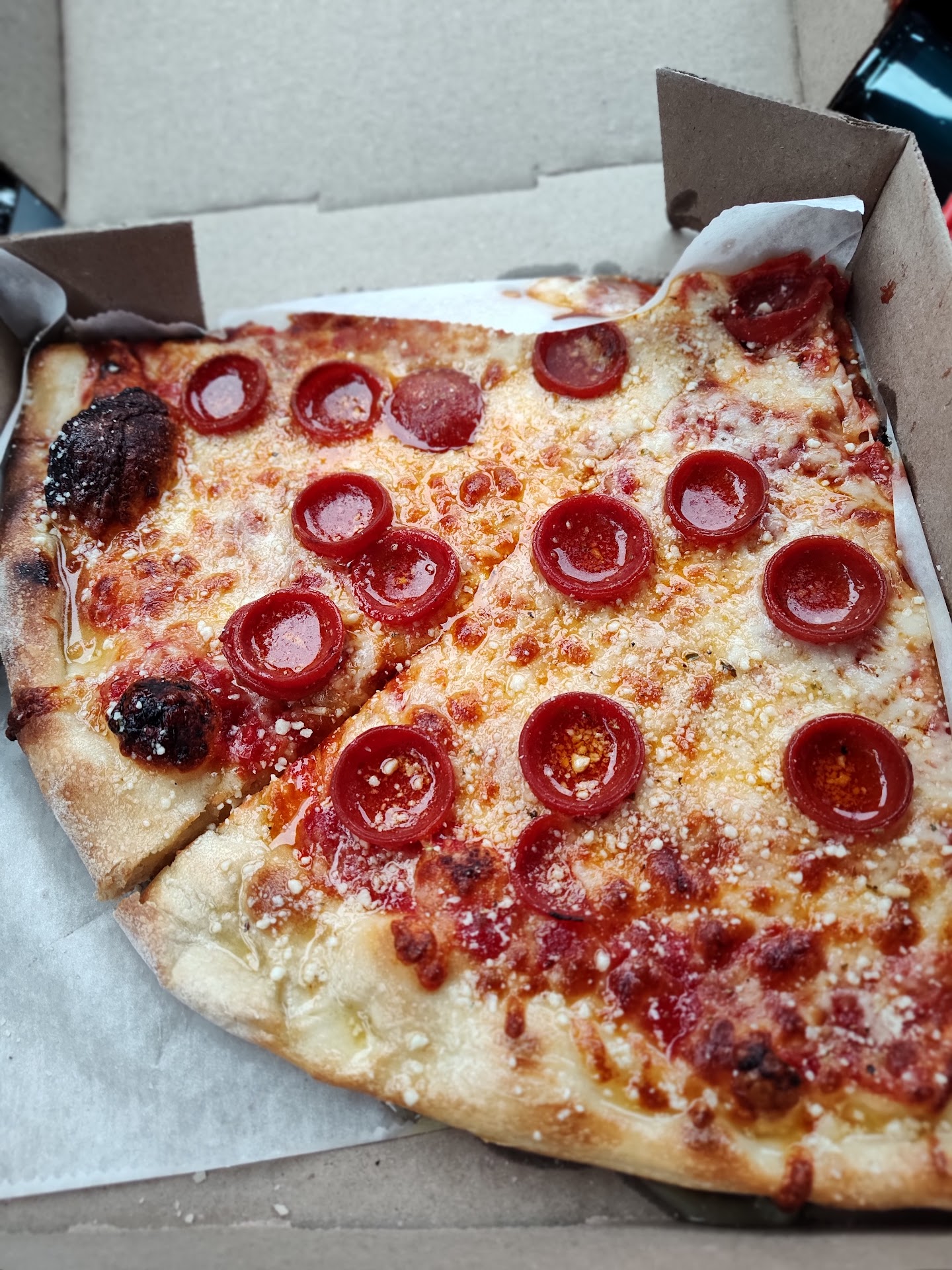 The large pizza we ordered, topped with bacon and pepperoni, was an absolute delight. The combination of savory bacon, zesty pepperoni, and the perfect amount of cheese created a mouthwatering medley of flavors. The crust, once again, stole the show with its thinness and crispiness, adding an addictive texture to each bite.