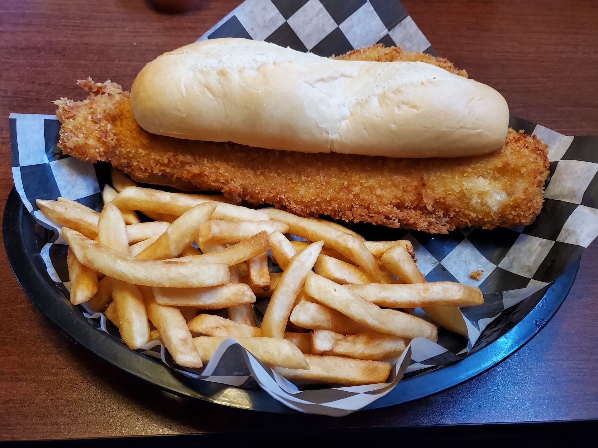 I was surprised to see how small this place is. It's just a small bar with table seating around the perimeter. That said, it's exactly what we were looking for at the time: a small hole-in-the-wall with good food and great service. There are televisions everywhere with various sporting events on display, and a good-natured crowd. The food is good and reasonably priced. My wife had a giant fish sandwich, which was delicious, and our son & I had bacon cheeseburgers which were very good. All were served with fries, which I don't think were fresh cut, but were still very good. We also got one of their Philly cheese steak "breads" to take home and try. They have a number of different "breads" from which to choose. They're basically loaves of Italian bread baked with toppings inside - not quite a stromboli or a traditional sub, but somewhere in between. All in all, although this wasn't our favorite place ever, we'll...