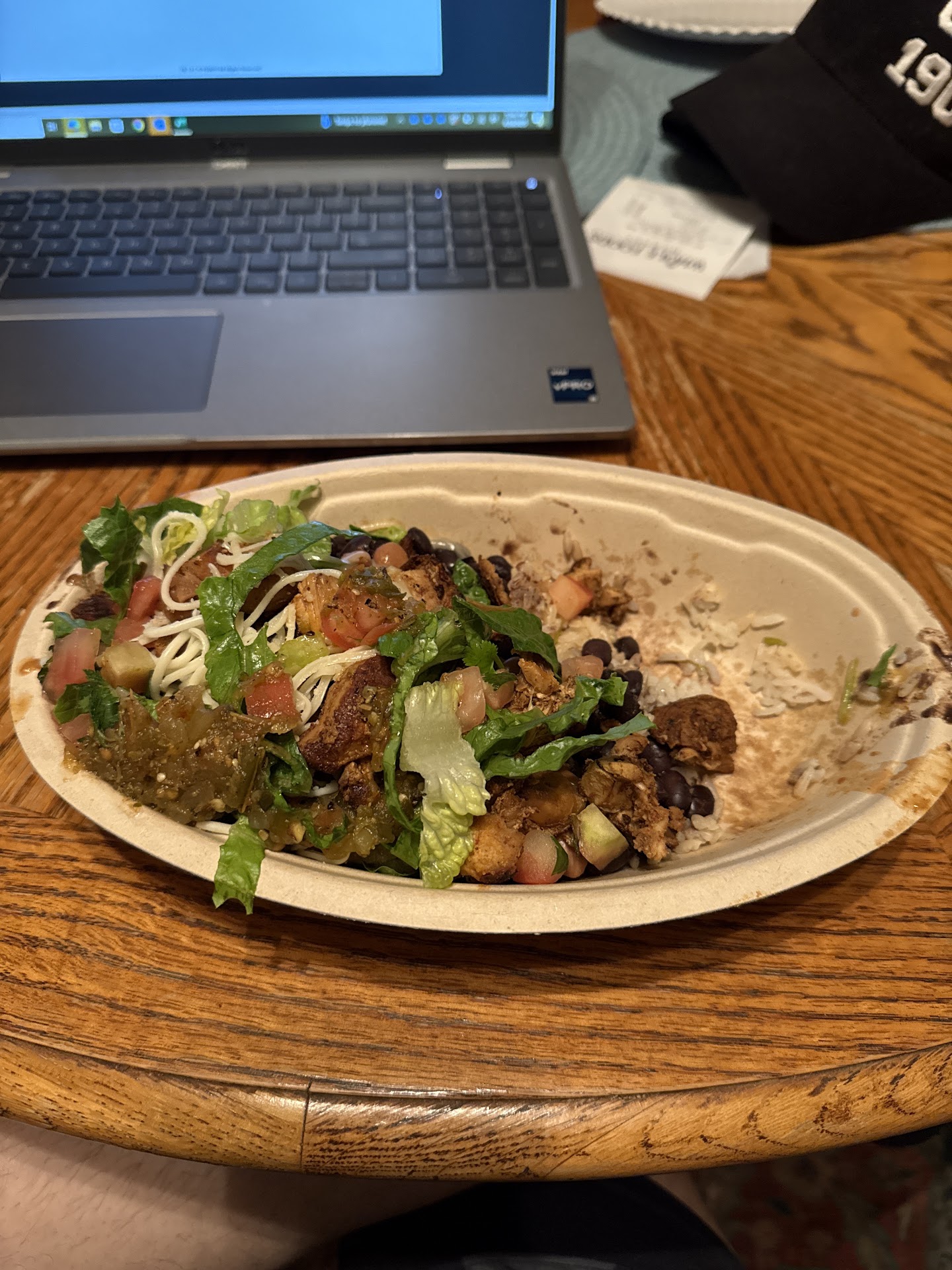 This is my second visit to this location. I ordered the Chicken Bowl with white rice, lettuce, cheese, sour cream, and Queso. It was made well and tasted good!