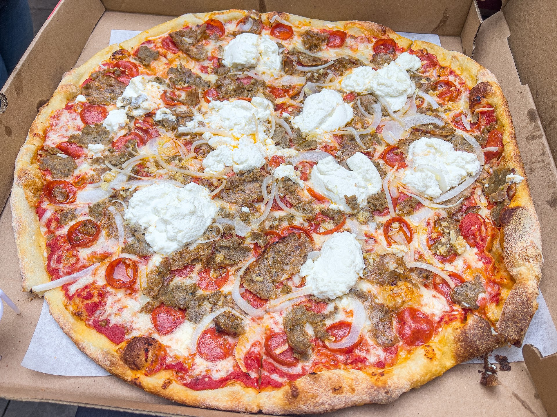 We got our pizza at 7:20, 2 hours after arriving. We got the meat pie, it should be renamed the ricotta pie. I was expecting some ricotta, not the 3 cups that were a top it in tablespoon sized clumps. The rest of the ingredients were proportional, and tasty on their own, but the immense amount of ricotta drown out any of the flavor and texture of the slices. I would suggest a thin layer of ricotta be spread on the dough under the red sauce or folded into it.