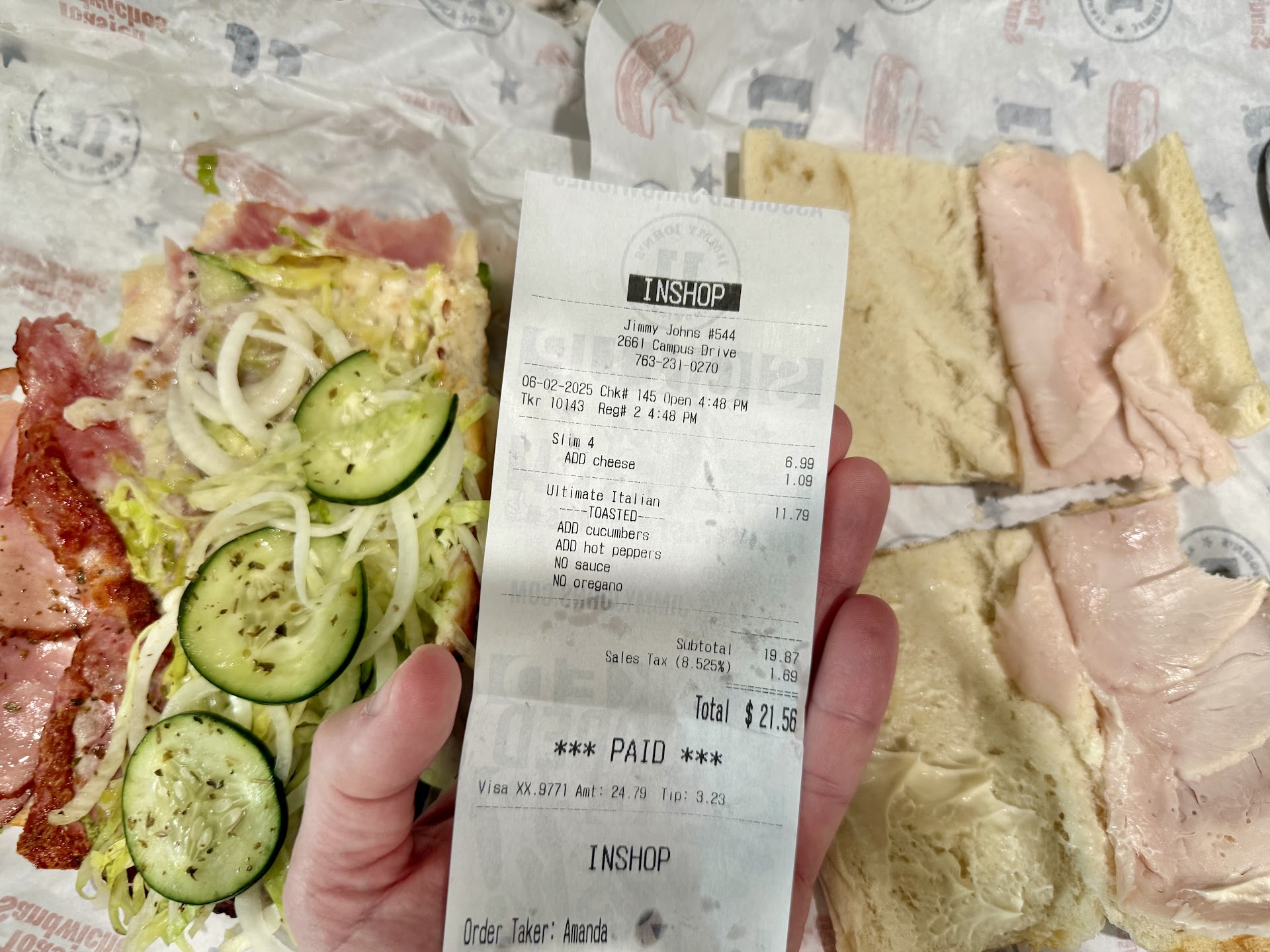 2nd: Errors are common. See pic for what I ordered vs received today. Slim 4 didnât have cheese, even though it was ordered and paid for. The other had âADD cucumbers, ADD peppers, NO oregano, NO sauceâ. They missed three of the four modifications. Seemed like a new guy making the sandwiches, but why wasnât anyone helping him and ensuring accuracy?