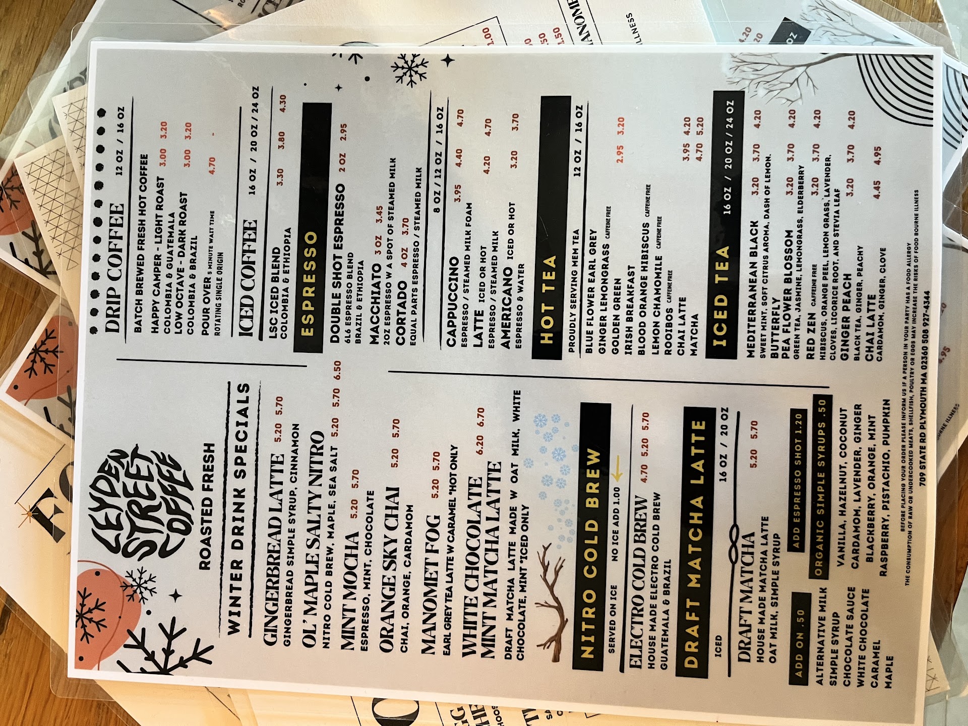 current menus are attached in photos. I’m not sure but I would imagine that drinks and food are subject to change around different months and/or seasons. Only my...