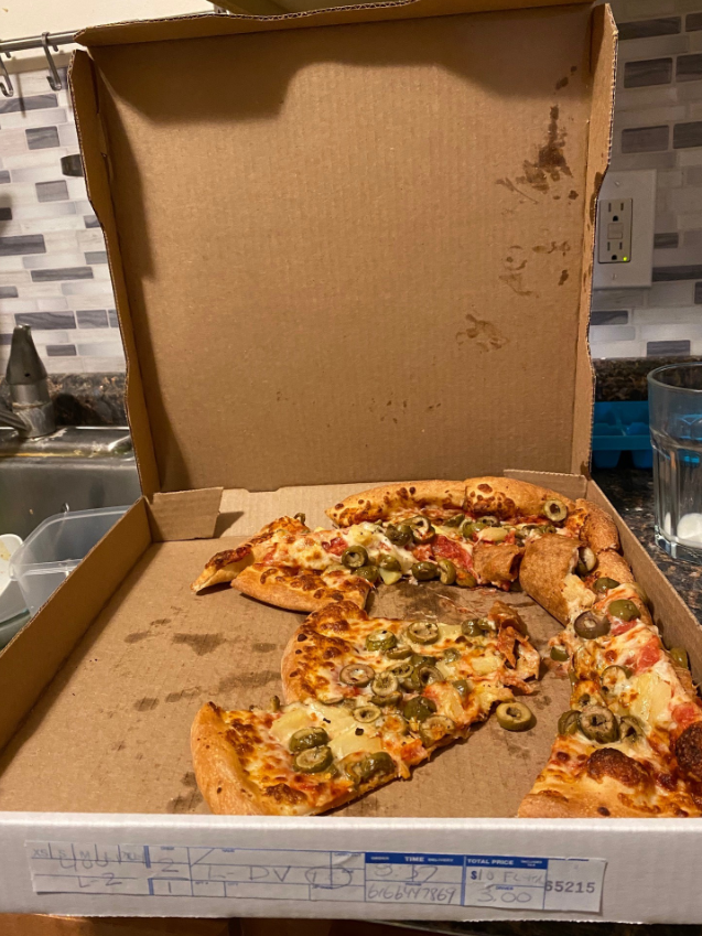 I ordered the pizza and a few cans of pop. Was told it would be here in 30 minutes. Guy shows up 45 minutes later... mind you our total bill was $3. WE TIPPED HIM $5!!! He handed us the box as if nothing was wrong. Got to the kitchen and this is the pizza we got. What blows my mind is that it's not a mess... if it was accidentally dropped, the pizza would have been everywhere. It looks like they purposely shoved the pizza in the box so that it was ruined... because they were angry that we ordered so late with a $3 bill. How petty and childish this is.