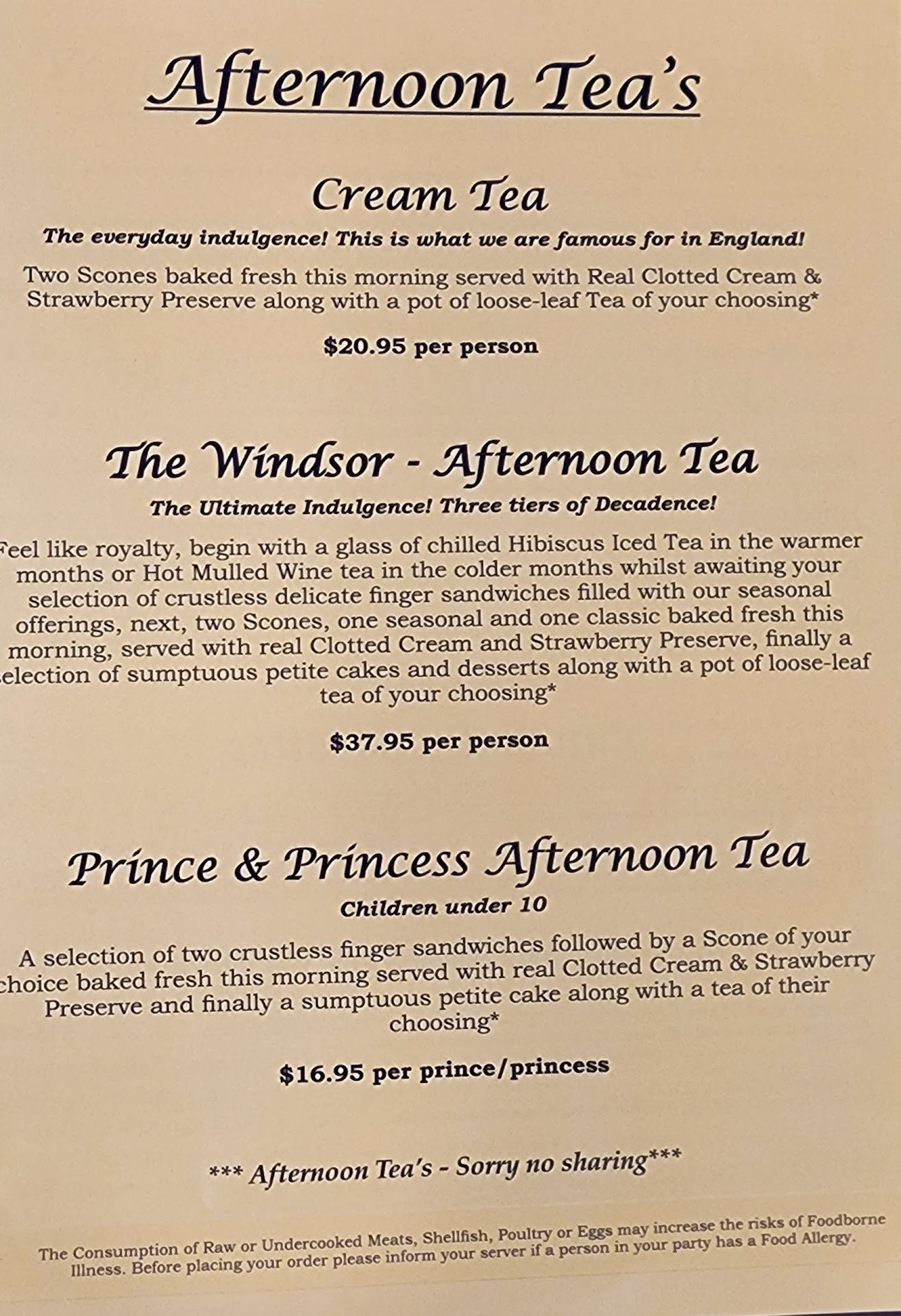 There are three types of tea you can get or you can get items ala carte. Cream tea - two scones, clotted cream, strawberry preserves. The Windsor Afternoon Tea - hibiscus ice tea during the warmer months or hot mulled wine tea in the colder ones. Crustless finger sandwiches, two scones (plain and a seasonal one) with the items above, a few desserts, and choice of tea Prince & Princess Afternoon Tea (for children under 10) - crustless finger sandwiches, one scone with with cream and preserves, and a petite cake and tea You could get a gluten-free afternoon tea as well.