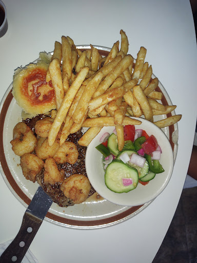 Down home southern food! The tea is almost as sweet as my dear mother used to make! Service was good and food was perfect! My wife and I both ordered the surf and turf, steak was larger than expected plus cooked to our request, shrimp were plump and lightly breaded, cocktail sauce was amazing. Cucumber salad was light and refreshing. Fries were crisp and tasty! The roll was delicious and surprising not sure how to describe it but here we go, the top of the biscuit was golden brown with fried cheese, the center was moist, thick and a good type of gooey! Nice atmosphere and the other patrons, who were locals, were charming! Located in an adorable but seemingly abandoned downtown area off the beaten path. After dinner we took a stroll across the street and walked along the water front. Very peaceful and...