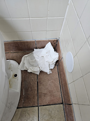The bathroom was worse. Womenâs restroom did not have any toilet paper. Debris everywhere. Menâs restroom apparently had maggots in there.