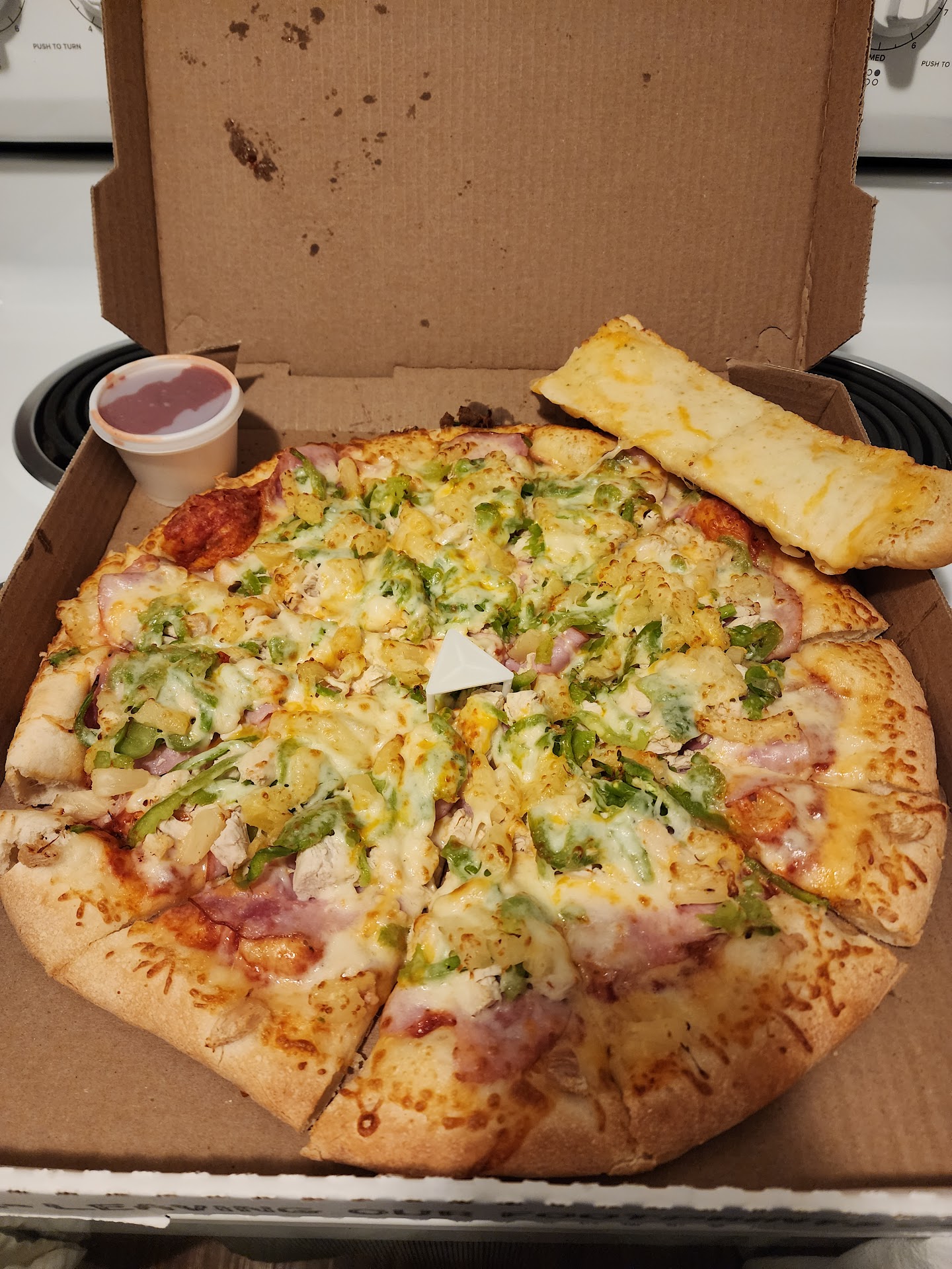 Read moreGood local pizza joint. Our party of 3 ordered a large, thinking we'd burn through it like we do with the large at any other chain. We not only filled up, but had leftovers for the 3 of us for 2 more days. Their large is VERY large, especially for the price. Their garlic cheese bread was also good and reasonably priced.
