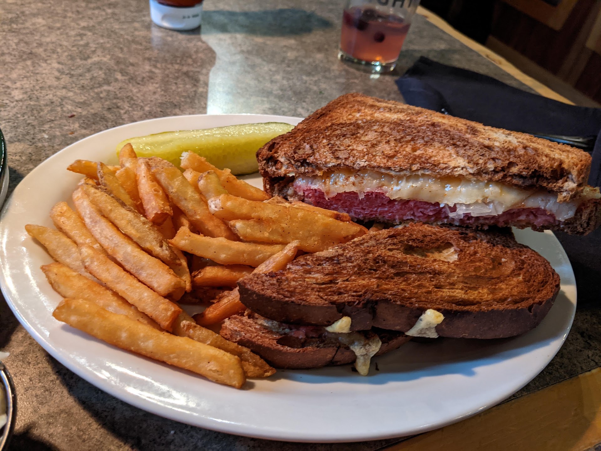 *Original: Friendly attentive service and big tasty dinners with beer and whisky - meat loaf and Greek salad - refreshed, relaxed, and satisfied after a long day...