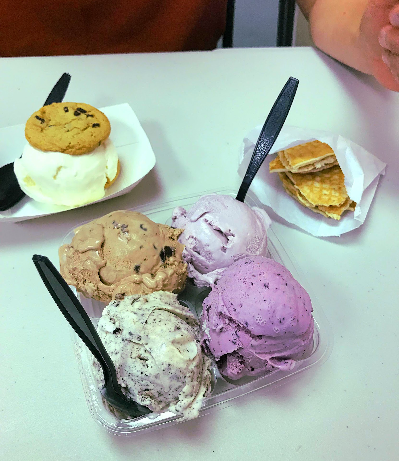 We tried Honey Lavendar (a little too sweet/soapy for me), Oreo Cookie Dough (YUM!), Berry Sunset (like a smoothie and cream, not too sweet), and Triple Chocolate Brownie (YUM! Not as chocolately as I expected, super even). With Waffle Chips instead of a waffle cone! But the smell of those waffles was so good.